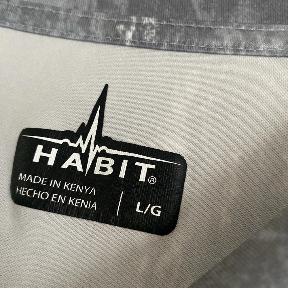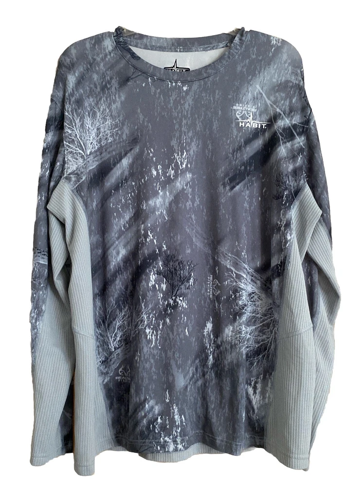 This Realtree Fishing Habit men's long sleeve shirt is perfect for any fishing enthusiast. The shirt features a camouflage pattern with a crew neck color gray/white. It is made of lightweight and breathable polyester knit fabric, which makes it suitable for all seasons. The shirt is machine washable and has easy care, double-sided, and moisture-wicking features. It comes in a gray color with a graphic print of a fish and is available in size L.