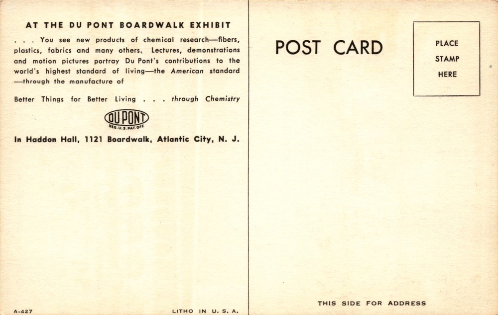 MAKE AN OFFER. THE MORE YOU BUY THE BETTER DEAL I WILL ACCEPT The postcard advertises the Du Pont exhibit at Haddon Hall in Atlantic City, New Jersey, as part of the Du Pont Boardwalk Exhibit. The exhibit showcases new products of chemical research such as fibers, plastics, and fabrics.