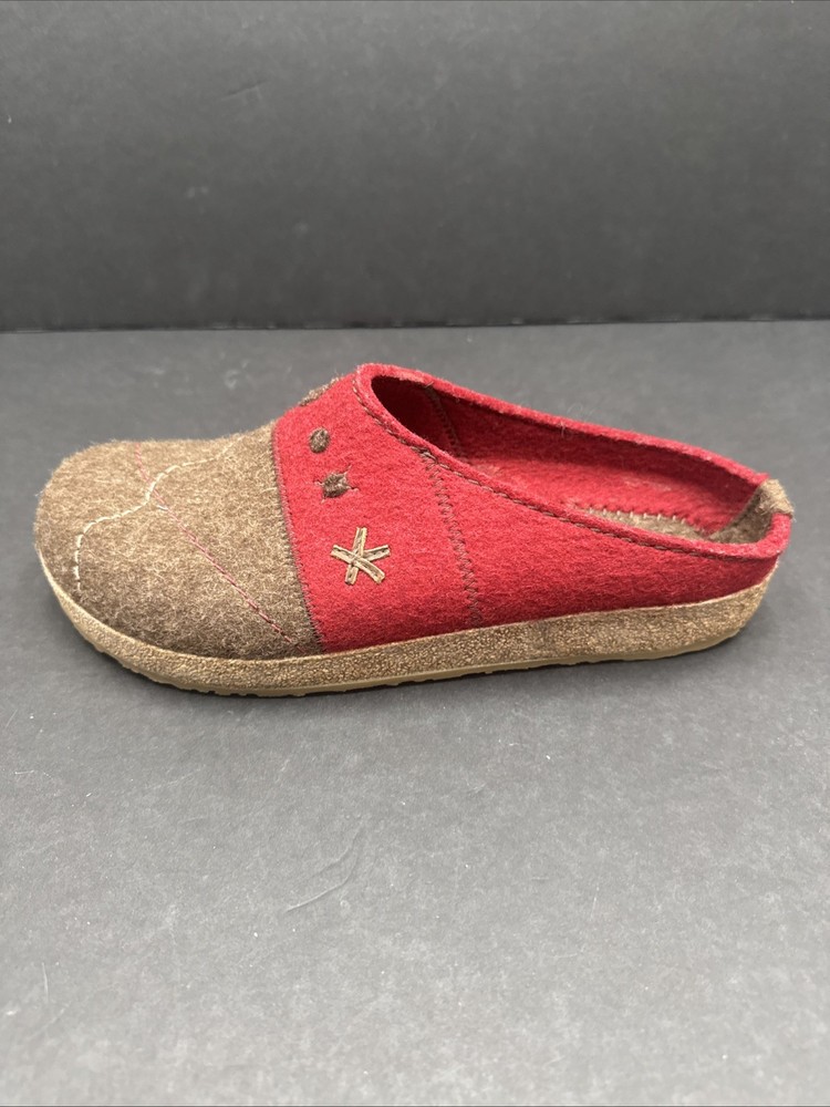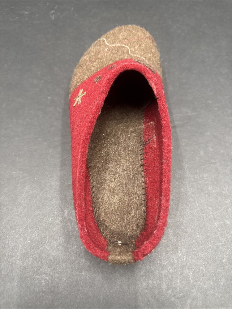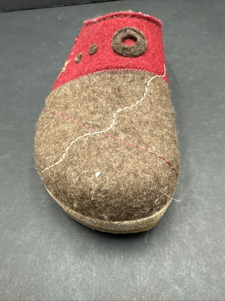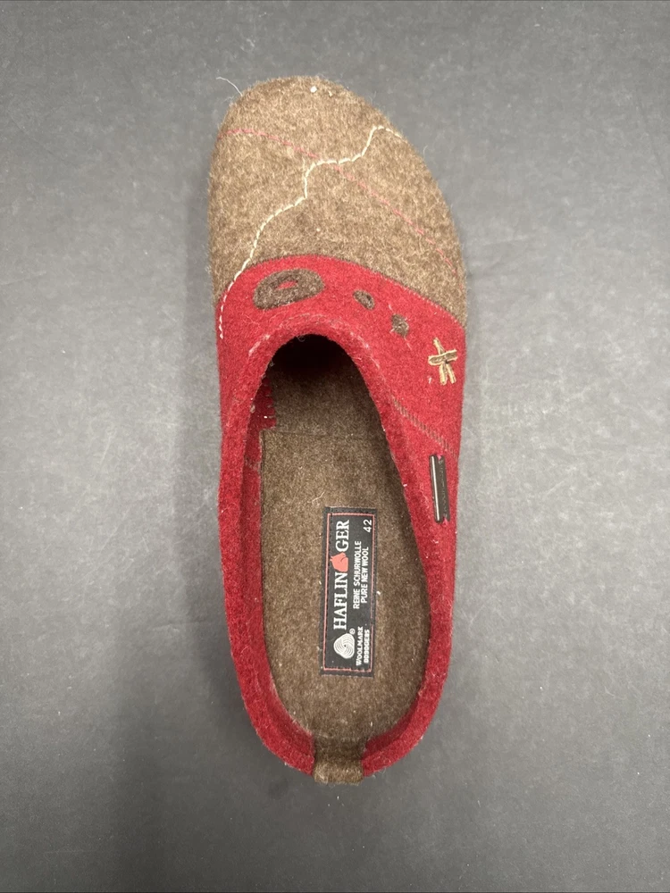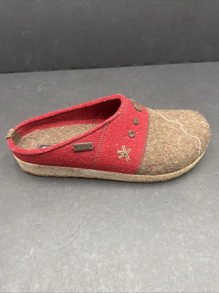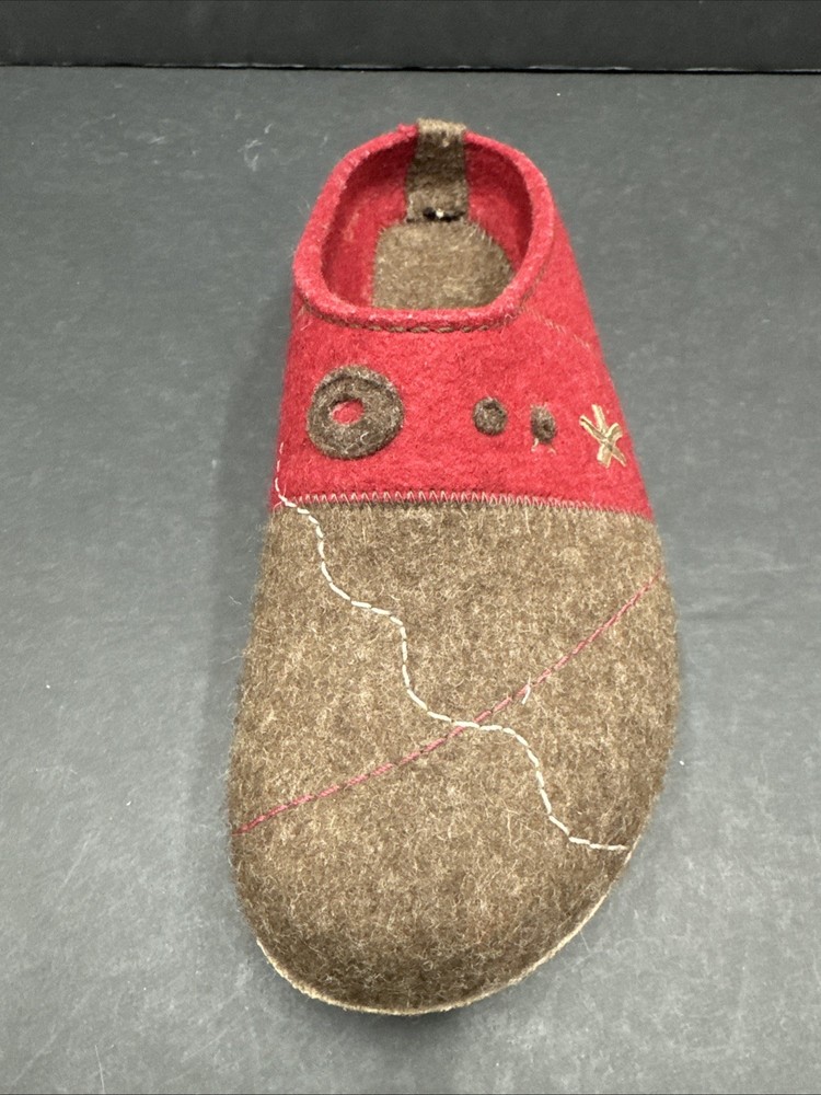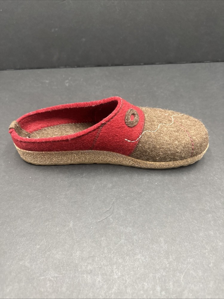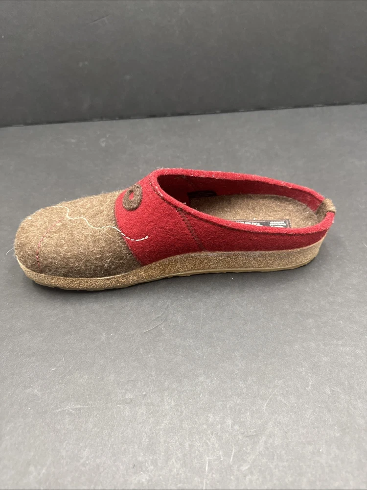 The Haflinger Women's Tristan Clog in Chocolate/Paprika is a comfortable and stylish slipper designed for women in size 42 (US 10.5). Made with wool upper material and featuring a flat heel, these clogs are perfect for lounging around the house or as a casual shoe for everyday wear. The brown color and clog style add a touch of sophistication to these cozy slippers, making them both practical and fashionable for any woman's wardrobe.