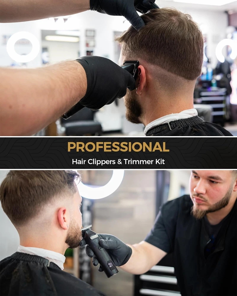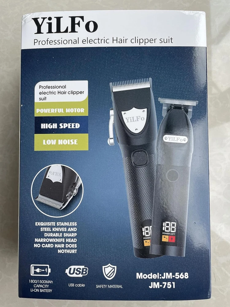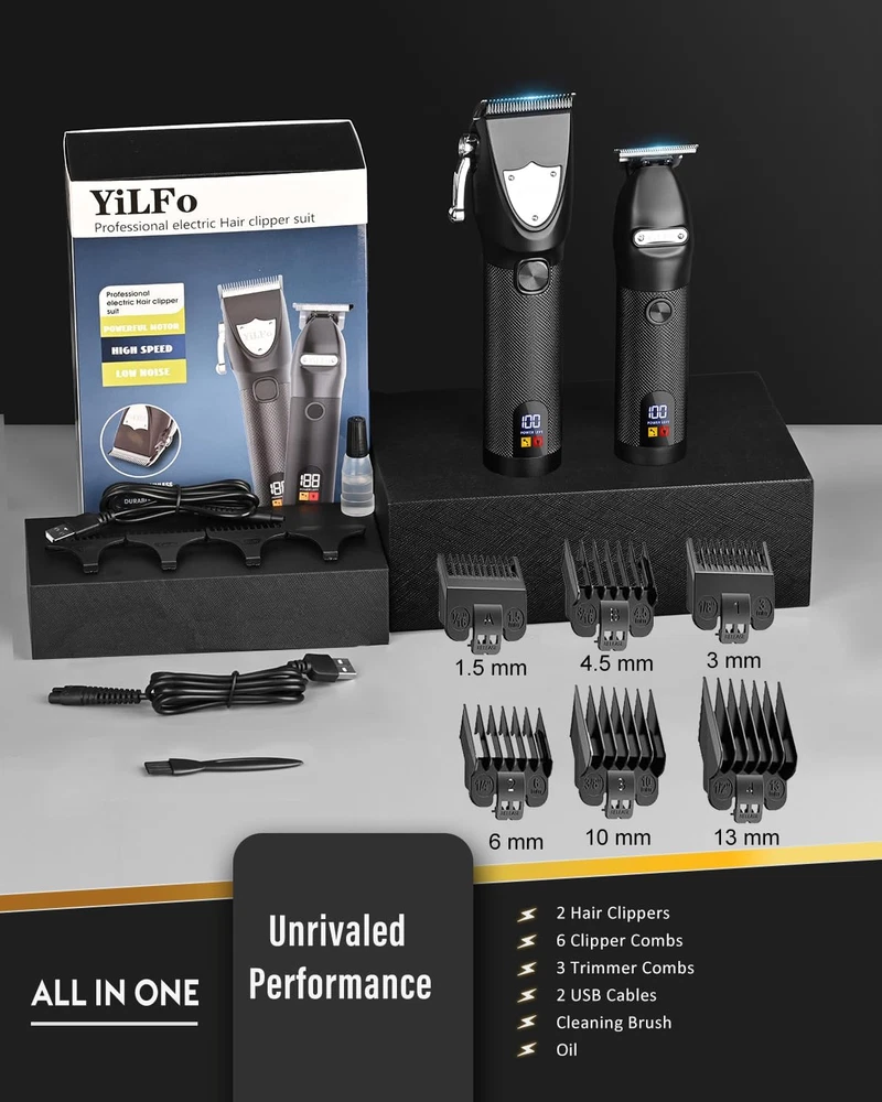 All in One Hair Clipper Grooming Kit: Two hair clippers, two USB charging cable, two dust proof guide combs, three regular guide combs (1/2/3 mm), six replaceable guide combs (1.5/3.0/4.5/6.0/10/13 mm), oil, English manual, cleaning brush. With this hair clipper set comes multiple accessories, the working is simple and easy to use. Hairstye design for the whole family can be done easily with one machine Large LED, USB Charge: Still worried giving up halfway for your self cut? Not more worries from YiLFo haircut kit with LED display, show the remaining power/charging reminder/oiling prompts. Still struggling with a corded restricted haircut? YiLFo wireless hair clippers with USB 2.5 hours fast charging for 150 minutes wireless running, and completely relieve your battery anxiety! The USB charge interface is compatible with various devices as computers. Worldwide universal voltage for travel Upgrade Blades Equipped Powerful Motor: Double layer steel blades, smooth and not stuck. Clipper and trimmer set with many different lengths combs(the number represents the reserved hair length), even beginners can easily learn to cut hair no excessive trimming or uneven layers. You can freely choose the length of hair. Strong power, up to 7000 rpm, stable performance, and cut hair machine for men can easy to complete satisfactory shape. Keep clippers dry as this will make the blades last longer Professional Salon Barber Clippers Sets: Professional maquinas para cortar cabello with complete accessories, suitable for hair stylists, hairdressing students, image designers, hairdressing knowledge lovers. As a barber, if you can combine your skills combined with this hair and barber kit, your haircutting work will be more comfortable and your haircutting business will flourish Sets for Him, After Sales: Matching maquina para cortar pelo packed in exquisite packaging boxes. On special occasions such as Anniversaries, Birthdays, Father's Day, Christmas, etc as a set to your loved ones, boyfriend, husband, dad, why not? YiLFo team launches quality products and provides timely service. If you have any questions about this two piece set cordless clippers for men, please contact us in time. Our Team will reply to you as soon as possible Product Description YiLFo Clippers and Trimmers Set, All in One, Sleek and Easy to Hold All sets are packaged in a beautiful black gift box, making your ideal gifts for Christmas, New Year, Birthdays and Anniversary!!!