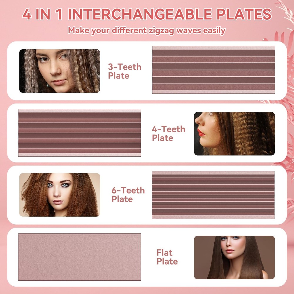 Your ultimate hair styling tool that can do it all! Whether you're looking to achieve straight locks or beachy waves, this hair straightener can help you transform your hair with ease. The ceramic plates of this flat iron straightener offer even heat distribution, ensuring that your hair stays smooth and damage-free. With 4 temperature settings, you can customize the heat to your hair's needs. The dual voltage makes it perfect for travel, allowing you to take your hot tools with you wherever you go. Not only can this hair waver make your hair straight, but it can also crimp the root of your hair for added volume and texture. To take it up a notch, pair it with our volumizing hair clips and create the look you've always wanted. This flat iron hair crimper is especially great for black women's hair and anyone looking for some extra volume. If you're short on time, use the bedhead waver iron to create quick and easy beach waves or use the hair crimper for women for an edgy texture that completes your outfit. ππͺππππππ π―ππππππ π·ππππ & 4 π»ππππππππππ πͺπππππποΌThe hair crimper with the latest ceramic heating plate helps to reduce frizz and add a lot of shine. Double-sided lacquered design to avoid scratching fingers when replacing plates. 320/360/390/430/430Β°F (160/180/200/220Β°C), four different temperature levels for all hair types such as short/long/thin/thick/soft/hard and coarse hair. π€³π½ππππππ π―ππππππππποΌIncluding three different sizes of deep waving plates and one straight plate, Sixriver hot tools flat iron, as a Christmas gift, can fully meet the needs of different hairstyles. You can easily switch between straight and curly hair with the crimper hair tool in your daily life, as well as tousle your roots. 80's fashion is making a comeback, and curly hair is definitely here to stay! ππ¨πππ-ππππππ π«ππππποΌReplacement plates of volumizing hair clips are infused with keratin and argan oil for moisturizing and nourishing properties that deliver shiny, less damaging styling results. Electric ceramic emits millions of negative ions to smooth cracked hair cuticles and lock in the hair's own natural oils and moisture. βοΈπ«πππ π½ππππππ π«ππππποΌProfessional special waver hair tool with dual voltage design (100-240V), you can take the iron to Asia, Europe, North America or anywhere (in some cases you need to equip with an adapter). 360Β° swivel cord design prevents hair from tangling. ποΈπ·ππππππ π°πππππ πποΌ1*hair crimp iron; 8pcs*replacement plate; 1*glove; 2*hair clips; 1*replacement plate bag. Flat iron straightener is designed with widened plates to be able to handle more hair at a time.