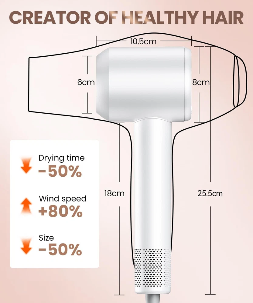 Hair Dryer, 140, 000 RPM High Speed Blow Dryer for Fast Drying, White Product Details 【5X Fast Drying Hair Dryer】The Meditoross hair dryer is embedded with a 1500W high-speed brushless motor, demonstrating outstanding performance during operation. With a rotation speed of 140,000 RPM and a wind speed of 25 M/S, it can swiftly transform wet hair, whether short or long, into smooth, dry tresses within 2 - 5 minutes, ensuring you feel confident and radiant throughout the day. 【Intelligent Temperature Control】The Meditoross hair dryer is integrated with an advanced intelligent temperature sensing and regulation system, which can achieve real-time and precise temperature adjustment. This system conducts 100 temperature checks per second to ensure a constant and stable airflow temperature, effectively protecting the natural luster and elasticity of hair and providing all-round care for hair health. 【4 Temperatures & 3 Speed Settings for Versatile Styling】The Meditoross hair dryer is furnished with 4 temperature options (room temperature, warm air, hot air, and cool-hot alternating mode) and 3 speed levels (low, medium, and high), allowing for 12 distinct combinations of temperature and airflow. This enables precise control over heat and air volume. Our hair dryer is designed to accommodate all hair types and cater to diverse styling preferences. 【Compact and Quiet: Ideal for Travel】Weighing just 0.95lb (431g),Hair dryer 381g, smooth air nozzle 50g, this lightweight hair dryer is perfect for both home use and travel. Its compact design, comfortable grip, and user-friendly buttons (Switch/Wind Speed/Temperature Settings) make it easy to handle. Additionally, advanced noise reduction and soundproofing technology ensure a peaceful and comfortable drying experience.