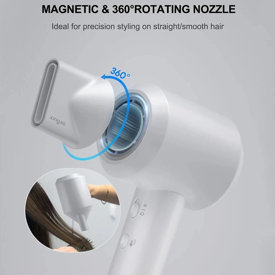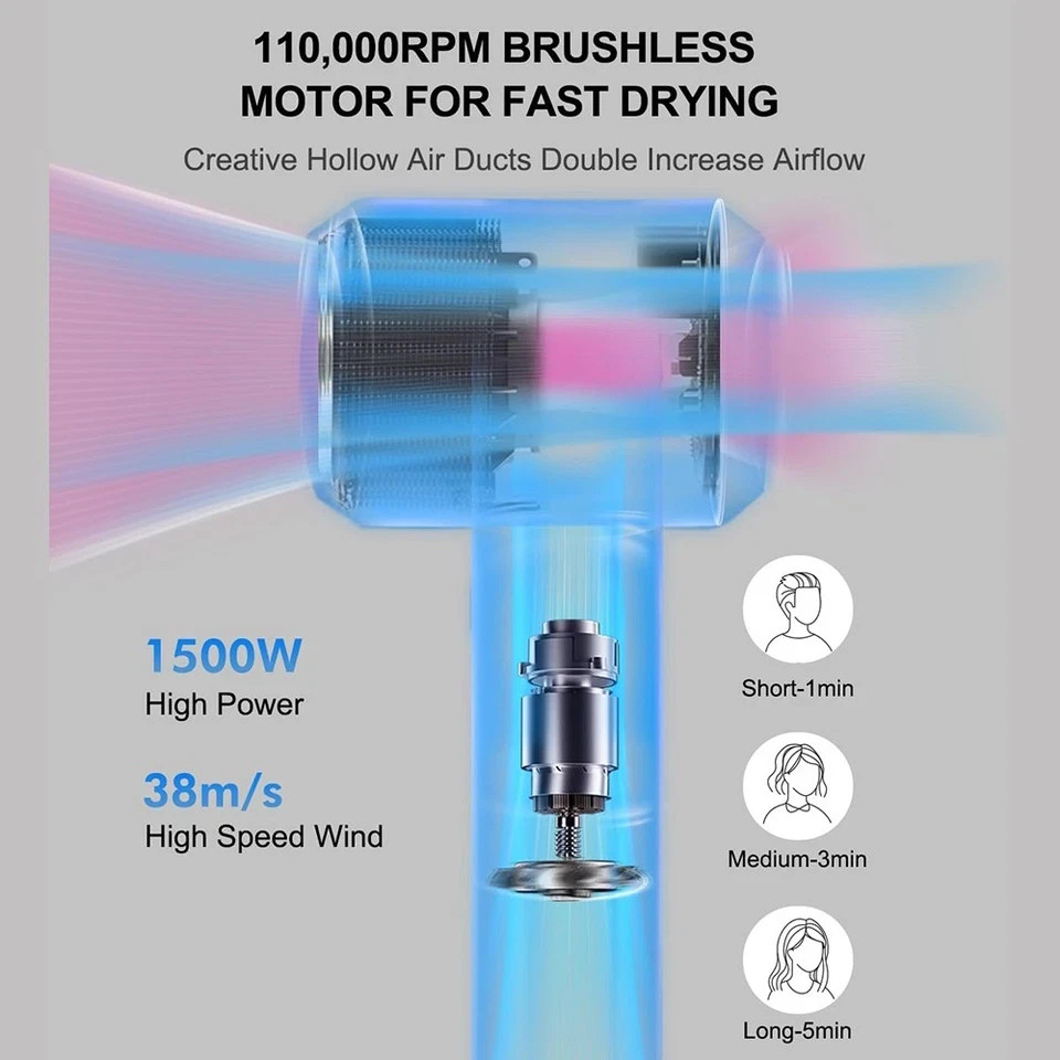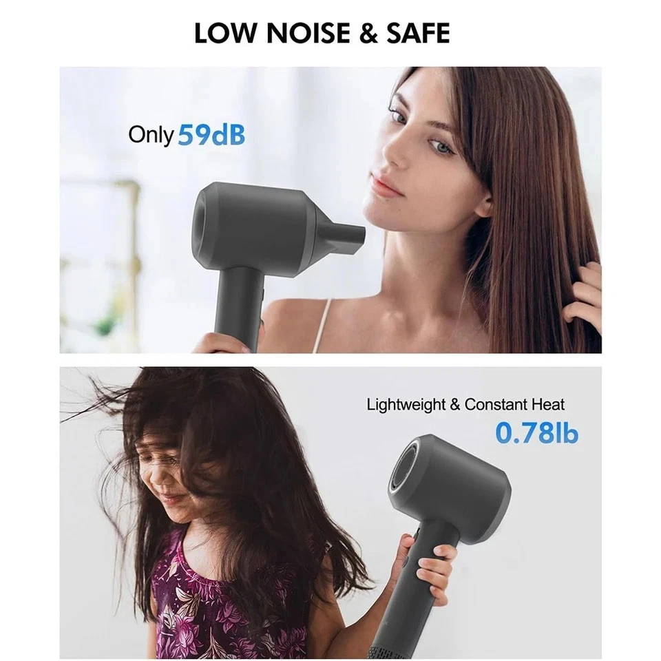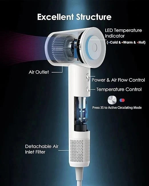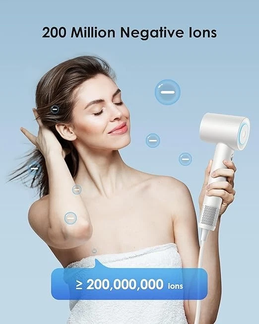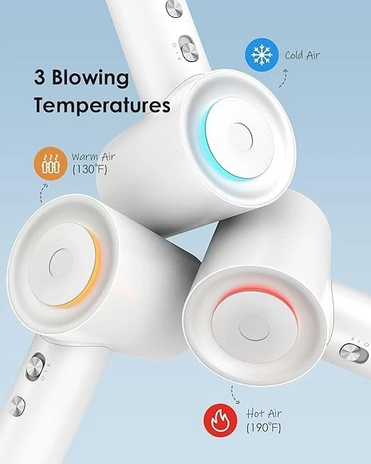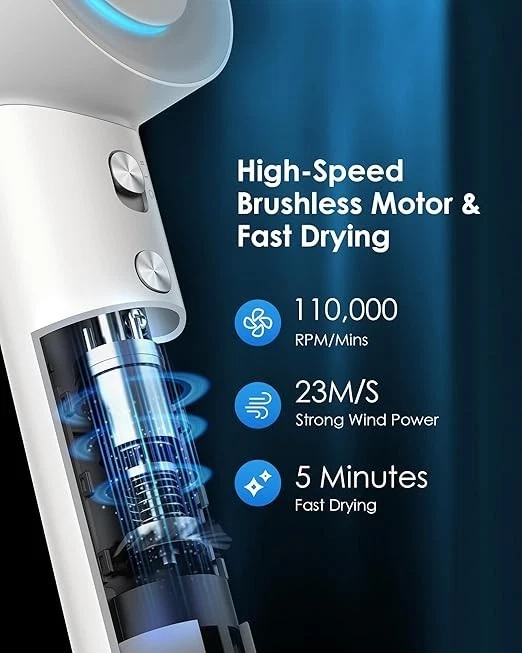 Fast-Dry High-Speed Hair Dryer: 110,000 RPM brushless motor for strong airflow and quick drying in 2–8 minutes. Anti-Static Ionic Technology: Releases 200 million negative ions to reduce frizz and leave hair smooth and shiny. Smart Heat Control: Prevents heat damage with automatic temperature regulation. LED lights show heat mode: red (hot), yellow (warm), blue (cool). Safe & Reliable: FCC certified with overheat, over-current, and over-voltage protection. Magnetic nozzle and anti-hair-suction filter. Lightweight & Travel-Friendly: Only 0.9 lbs. Perfect for home, travel, and as a Christmas gift.