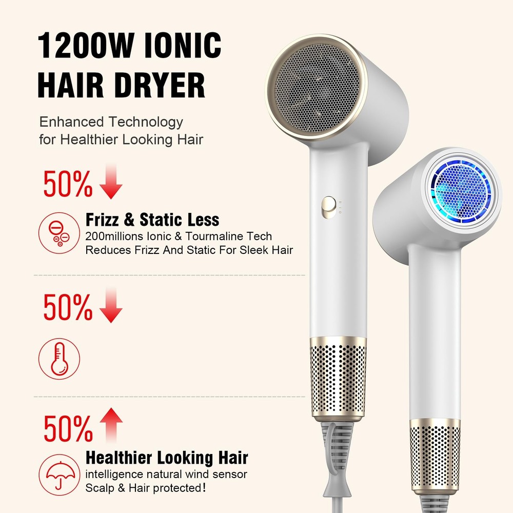 Hair Dryer Fast Dry 1200W Professional Ionic Hairdryer, Super Compact & Lightweight with Even Heat Anti-Static, Frizz-Control, Quick Drying, Energy Saving, Hairdryers for Women & Man 【Advanced Hair Care Technology】- salon-quality Experience at home with hair dryer's advanced features. ①Built-in chip Control of the heat and speed Helps prevent over-drying and over-styling damage,Delivers maximum shine,Maintains your hair's natural moisture.②while the built-in hair care ions to nourish your hair and repairs your hair scales. Smooth unwanted frizz and create shine on hair 【1200W Faster Drying Your Hair】- This ionic hair dryer powered by a high-speed robust motor and advanced aerodynamic design, not only providing a powerful airflow for optimal styling effect, but also longer service life than other hair dryers.2-5 minutes fast dry depending on hair thickness and length. 【3X Ceramic Coating & Lower Radiation】- This hair dryer has 3x Ceramic Coating that ensures even heat for less damage while Tourmaline Ionic Technology tames frizz for sleek, healthy hair. It also have a overheated and low electro magnetic fiel protection. Low magnetic wave structure saves energy, has a low radiation than similar hair dryer 【200 Millions Ionic Technology】- The dryer harnesses an Ionic generator, which emits 200 Millions Ionic for ideally, long-lasting frizz-free results.the hot air travels through the grille and releases more ions than a standard dryer, leaving you flyaway free with healthy-looking lustre with serious shire after every styling session. 【Turbo & Cool Buttons】- Dry and Style With Ease Innovative Turbo Heat increases airflow to dry up to 50% faster, while the Cold Shot releases cold air to lock in styles. 【Safe & Family-Friendly Design】- Built-in overheat protection ensures safe operation, while advanced low-EMF technology reduces radiation by 50%. A healthier choice for everyday styling, suitable even for kids and expectant mothers.
