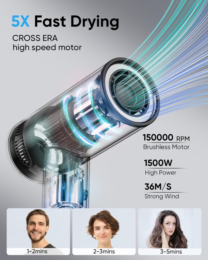 Hair Dryer with Diffuser, High-Speed 150000 RPM for Fast Drying, Lightweight, One-Touch Cool Air Button, 500 Million Negative Ionic Blow Dryer with Magnetic Nozzle, HD Display Fast Drying: The hairdryer features a high-speed 150000 RPM brushless motor with wind speeds up to 36m/s, powerful airflow makes it possible to dry hair in less than 4-7 minutes. It dries hair 5 times faster than any traditional hair dryer while also caring for your hair Revolutionary Ionic Technology: This diffuser hair dryer releases 500 million negative ions per second to nourish and care for the hair, reduce frizz, and provide a comfortable experience for clients Versatile Temperature Control: Our hairdryers offer 3 temperature settings. The one key cold air button can quickly switch between cold or hot air, suits all hairstyles. The HD display simplifies adjustments for a comfortable experience. The hair dryer has an overheating protection device, overheating will automatically stop running No Heat Damage: The blow dryer with diffuser is equipped with an NTC Smart Temperature Control Sensor that monitors air temperature over 500 times per second, effectively preventing hair from overheating damage Lightweight: This ionic hair dryer has made a revolutionary and innovative design in terms of body compared to other hair dryers, unlike the previous heavy body, it weighs only 0.74lbs.Its lightweight design minimizes arm fatigue and still provides a comfortable experience even after long hours of use Please note: Please read our user manual carefully before use. WARNING: DO NOT place or store appliance where it can fall or be pulled into a tub or sink, and do not place in or drop into water or other liquid