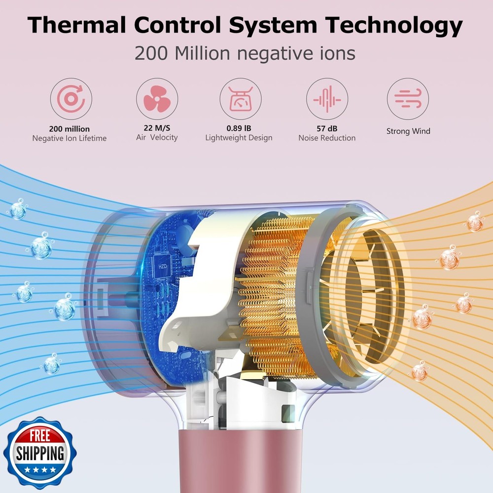 Hair Dryer, Ionic Blow Dryer, 1500W High-Speed Hairdryer with 110000 RPM Brushless Motor for Fast Drying Low Noise, 4 Temps and 2 Speeds with Magnetic Nozzle Features High Speed Hair Dryer:Equipped with a 110,000 RPM high-speed brushless motor that delivers wind speeds of up to 22 meters per second, this hair dryer dries hair in just 2-5 minutes - five times faster than traditional hair dryers - ensuring efficient drying, frizz reduction, and shine enhancement, so you can enjoy the comfort of a professional salon in the comfort of your own home. Protects Hair and Improves Hair Quality:Intelligent thermal control system technology of the hairdryer keeps the temperature at 52 °C by alternating hot and cold airflow. It monitors the air temperature 100 times per second and regularly makes small adjustments to prevent your hair and scalp from being damaged by extreme heat. Negative Ion Hair Dryer:Hairdryer uses advanced negative ion technology, the ion generator can produce 200 million ions per cubic centimeter, neutralizing static electricity, preventing hair damage reducing static electricity, locking in moisture, leaving your hair soft and shiny and easy to care for. Low Noise and Light Weight:Our hair dryer weighs only 0.89 lb. Small, portable and ergonomically designed, it's perfect for home and travel use. Although the hair dryer has a powerful motor and wind speed, it operates at only 57 decibels. Late night hair drying won't disrupt your family's sleep. Smart Tri-color LED Ring Light Design:The three colors displayed on the circular LED ring correspond to the temperature settings of the hairdryer. Red means 78 degrees (hot air), yellow means 49 degrees (warm air), blue means cold air. Press and hold the button for two seconds to activate the intelligent circulation mode, which alternates hot and cold air every few seconds to prevent extreme heat from damaging your hair. Portable & Travel Friendly:For the gym or pool party, you can put it directly in your wet/dry bag to dry your body and clothes quickly, or you can use a blow dryer to assist in ironing your clothes when you are traveling, and then straighten the fabric by hand to achieve the ironing effect. Shipping Free & Fast Shipping: We offer free shipping to most of the USA with a normal delivery time of 3-7 days. However, due to the current situation, additional delivery time (up to 3 weeks) may be required for some items. Alternative Carriers: We may use alternative carriers (e.g., USPS, FedEx, UPS) to ensure your package arrives safely and on time. Due to the use of multiple carriers, we are unable to provide a tracking number automatically. Handling Time: Orders are processed and shipped within 1-2 business days of receiving cleared payment. Shipping Restrictions: Shipping to Alaska, Hawaii, Puerto Rico, Guam, and other US territories may incur shipping charges or delivery restrictions. Please contact us before ordering, or your order can be refunded/cancelled. State Restrictions: Certain items may not be shipped to California due to state regulations. Contact for Tracking Updates: If you require tracking updates or have any concerns about the delivery of your order, please feel free to contact us, and we will be happy to assist you. Return Policy 30-Day Hassle-Free Returns: If you are not completely satisfied with your purchase, you can return the item for free within 30 days of receiving it for a full refund or exchange. Easy Return Process: Contact us, and we will provide you with a prepaid return shipping label and detailed instructions. No Restocking Fee: There are no restocking fees for returns. However, the buyer is responsible for return shipping costs if the return is not due to a seller"s error. Refund Processing: Refunds will be processed within 1 business day of receiving the returned item in its original condition. Feedback Your feedback is extremely important to us. We strive to provide the best products and customer service possible. If you are satisfied with your purchase, please take a moment to leave us a positive review. If you have any concerns or issues with your order, please contact us before leaving negative feedback. We are committed to resolving any problems and ensuring your satisfaction. Contact Us If you have any questions or concerns, please feel free to reach out to our customer support team. You can contact us through the eBay messaging system. We are available Monday to Friday, 9:00 am to 5:00 pm EST, and we will do our best to respond to your inquiry within 24 hours. Thank you for supporting our small family business!