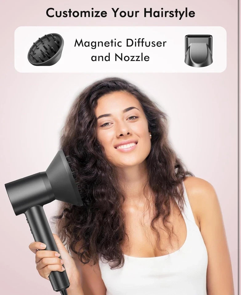 High-speed 160,000 RPM brushless motor Ultra-fast drying (1–5 minutes) Low heat + Cool air protection 500 million negative ions for smooth & frizz-free hair Intelligent heat control (110 checks/sec) Lightweight, low noise, travel-friendly Magnetic diffuser & nozzle attachments Memory mode for last-used setting USP (Unique Selling Points): 6x faster drying without heat damage Salon-quality results at home Safe for all hair types (curly, fine, thick, damaged, color-treated) ✨ OIMYE Professional High-Speed Ionic Hair Dryer Experience fast, safe, and salon-quality hair drying with the OIMYE High-Speed Ionic Hair Dryer . Powered by a 160,000 RPM brushless motor and 36 m/s airflow , it dries hair up to 6× faster than traditional dryers while protecting hair health. 💨 Low-Heat, Ultra-Fast Drying High-velocity airflow with controlled heat (max 167°F ) and a cool air setting reduces heat damage, locks in styles, and enhances natural shine. 💎 Advanced Ionic Technology Delivers 500 million negative ions to seal the cuticle, retain up to 90% moisture , reduce frizz, static, and leave hair smooth, silky, and healthy-looking. 🎛️ Smart Temperature Control & Memory Mode Intelligent system monitors temperature 110× per second with three modes—Hot, Warm, and Cool. Memory function recalls your last setting automatically. 🧲 Magnetic Styling Attachments Includes 360° magnetic diffuser and nozzle for easy styling, volume, and precision drying. 🔇 Lightweight & Quiet Design Only 0.89 lbs with advanced noise reduction ( <51 dB ), making it ideal for home, salon, and travel use.