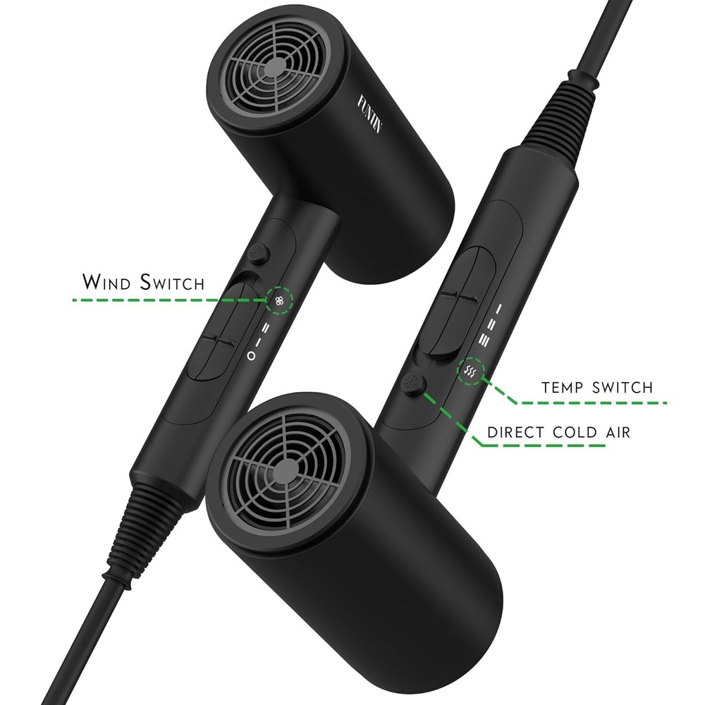 FUNTIN Hair Dryer, Blow Dryer with Diffuser Brush Comb for Women 4C Thick Curly Hair 1800w-Professional Black 💘ULTRA-FAST DRYING: Ionic Ceramic Technology combines highest 210F result a fast drying with no heat damage. Reduce the frizz and could dry your 4C thick hair faster than others hair dryer. 💘REAL 1800W POWERFUL OUTPUT: Products passed the U.S. UL859 and CPC certification approved US ALCI Safety Plug to better protect you during hair drying. 💘POWER AND VERSATILITY FOR EVERY HAIR TYPE: Powerful, fast-drying hair dryer for straight, wavy, curly, and coily hair With 3 kinds of accesssories: DIffuser, Brush and Nozzle! 💘ALL-AROUND BLOW DRYER: Intelligent Motor, Thermostatic temperature control, Negative ion technology....all be builted in body. Independent temperature adjustment switch and wind adjustment switch Powerful,All in one, it is a beautiful hair dryer with power!