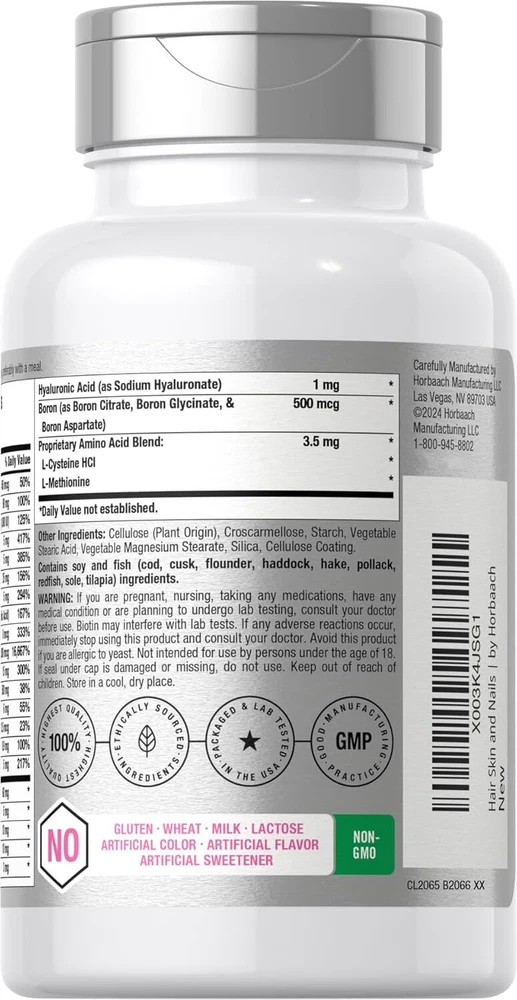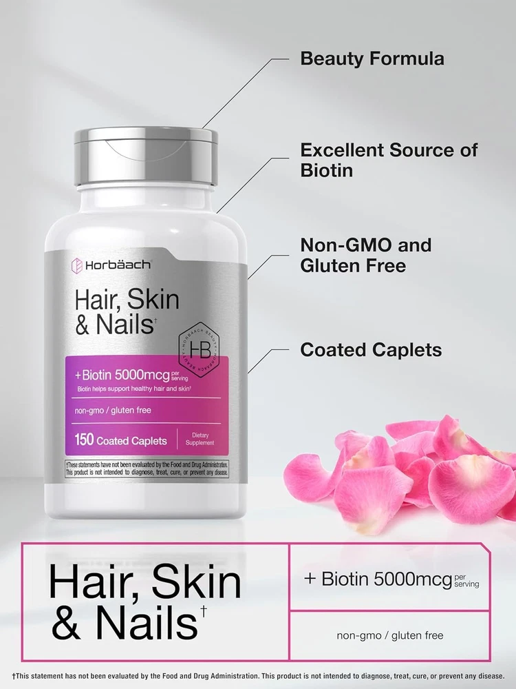 Fuel Your Inner Beauty: Nutrition plays an important role in fueling your beauty routine. However, it can be hard to achieve proper nutrients from diet alone. That's why a supplement can help provide the additional support you need to meet your daily requirements. Nutritional Care for Hair, Skin & Nails: There are many ways to treat your Hair, Skin, and Nails to the nutritional support they need. Supplements such as powder, liquid, capsules, gummies, chewable tablets and caplets, can now provide your body with key nutrients for a balanced beauty regimen, while topical products like cream, serums and oils are also common. Horbaach Hair, Skin, & Nails Gummies*: Fuel your inner beauty with Horbaach's coated caplets! Our advanced supplement features a complex blend of nutrients, including 5,000 mcg of Biotin per serving, Vitamin A, Vitamin C, and more. It's made with no artificial flavor or artificial sweetener, making it a perfect choice for any beauty regimen. *These statements have not been evaluated by the Food and Drug Administration. This product is not intended to diagnose, treat, cure, or prevent any disease. WARNING: If you are pregnant, nursing, taking any medications, have any medical condition or are planning to undergo lab testing, consult your doctor before use. Biotin may interfere with lab tests. If any adverse reactions occur, immediately stop using this product and consult your doctor. Avoid this product if you are allergic to yeast. Not intended for use by persons under the age of 18. If seal under cap is damaged or missing, do not use. Keep out of reach of children. Store in a cool, dry place.