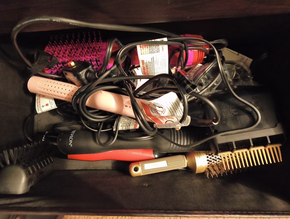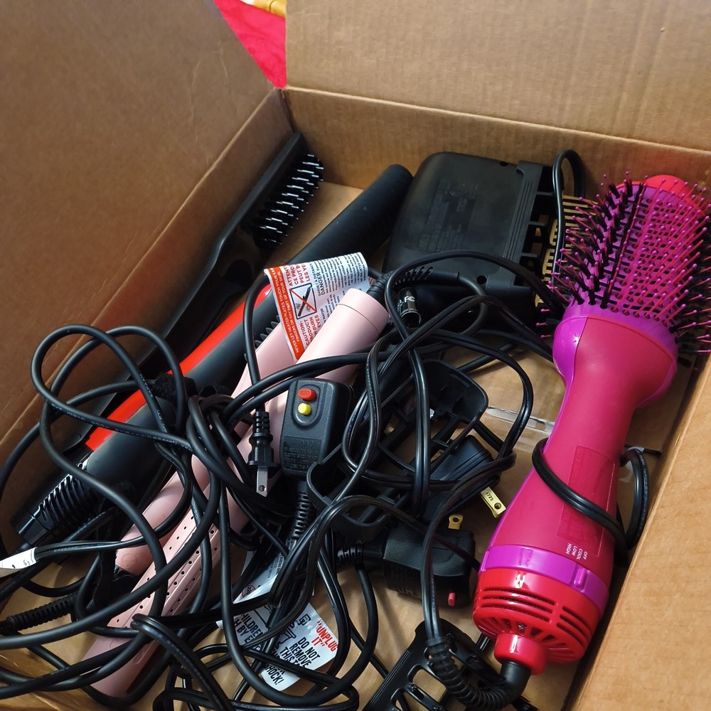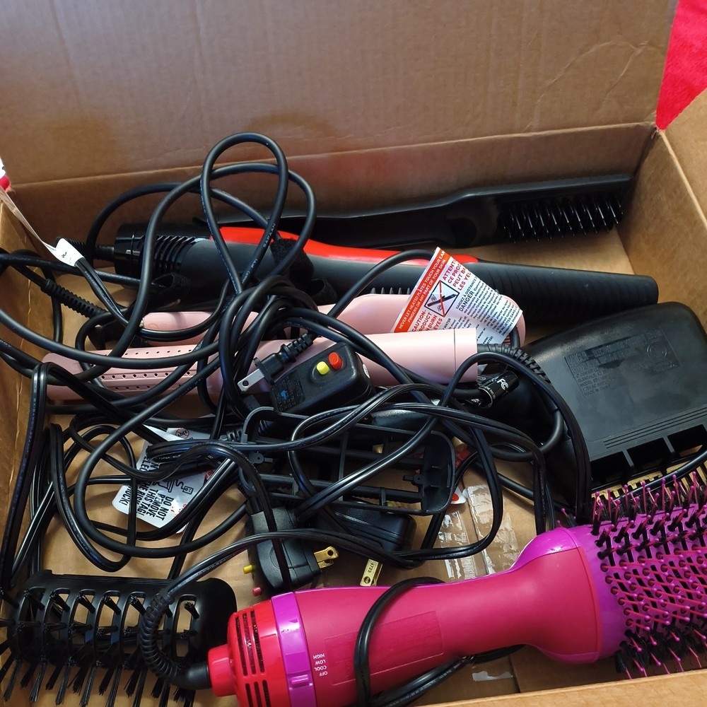 these are mixed brands to Revlon to TYMO hair straightener brushes, to flat irons, to blow dryer brush. used littlely in excellent condition. colors from pink to black. The bundle now includes the Revlon Round Brush blow dryer too