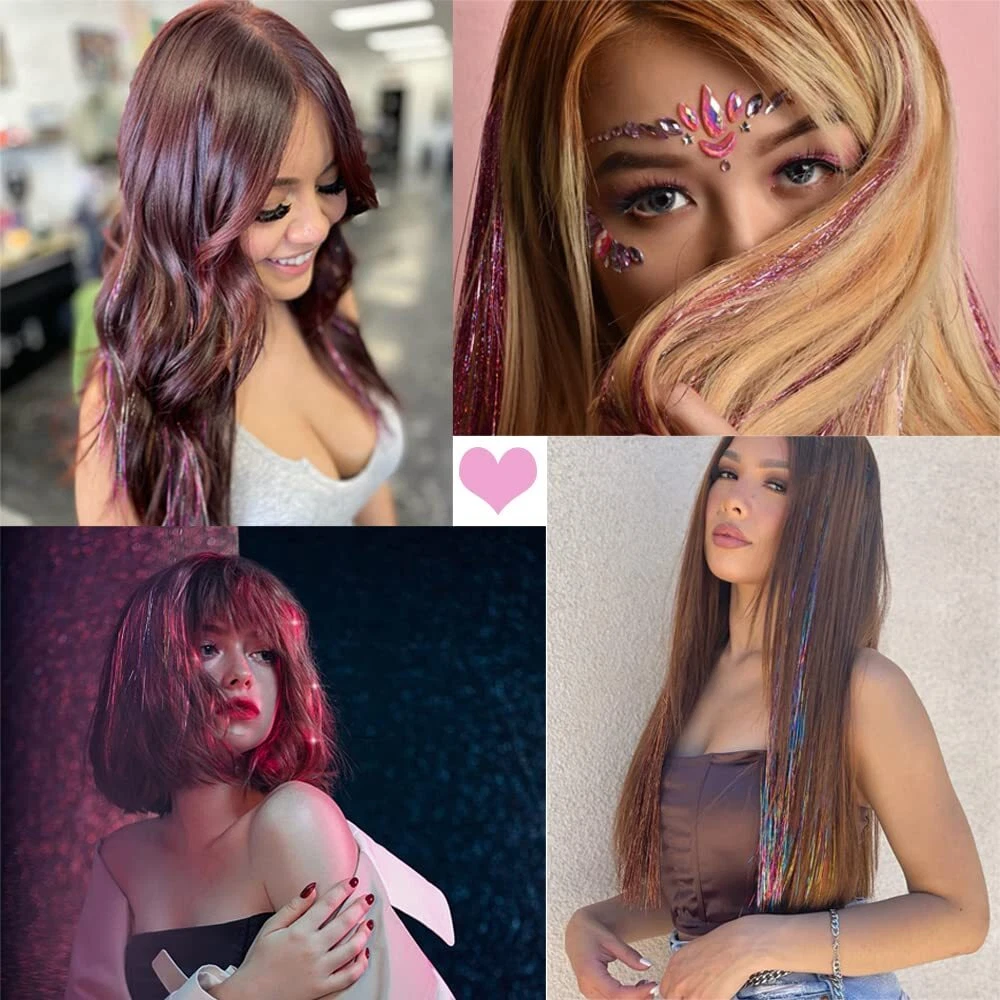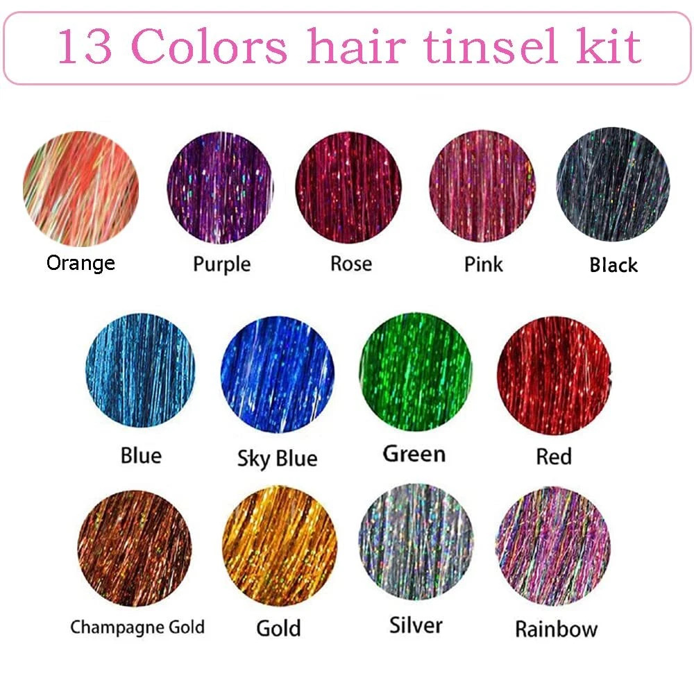Hair Tinsel Kit with Tools: 13 Colors 3600 strands hair tinsel , 1 piece crochet, 1 piece plier, 200 pieces micro silicone link rings beads (100pcs black + 100pcs brown), 2pcs Ponytail Hoop Tools,1pc Rat Tail Comb,1piece hair clips, 1 pack of Colorful rubber bands as a gift. Definitely worth it for the money. Hair Tinsel Safe: Hair tinsel made by 100% high quality polyester fiber hair tinsel. Safe, , tasteless and will not fade. Can be washed, blow-dried, straighten, ironing,cut into different length according to your hair extension requirements. Each color tinsel is packaged separately, which is more easy to identify and use. Fairy Hiar tinsel Easy Match Your Style: The hair tinsel is the latest trend in hair fashion and the perfect hair accessory for girls of all ages.Adds amazing colors and sparkle to hair. create charming and eye-catching effect , you get tons of compliments. Tinsel Hair Extensions: The hair tinsel strands 48 Inch are long enough , cut into different length according to your hair extension requirements.13 Colors to Choose: Orange, Gold, Silver, Pink, Violet, Sky Blue, ,Champagne Gold , Rose Red, Black, Red, Blue, Green, Rainbow.a variety of colors meet the various styles of fairy hair, Release Your Charm. Service: If you have any question or problem about the Hair tinsel kit, We provide 24-hours .