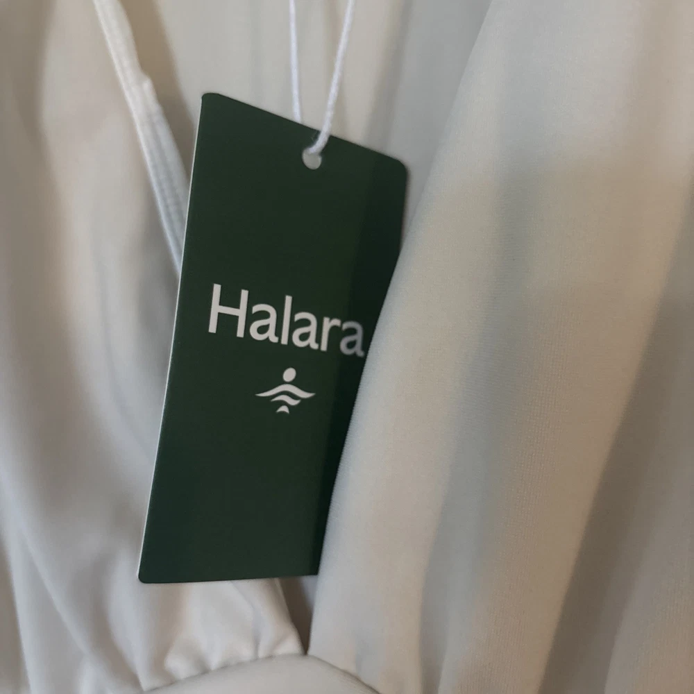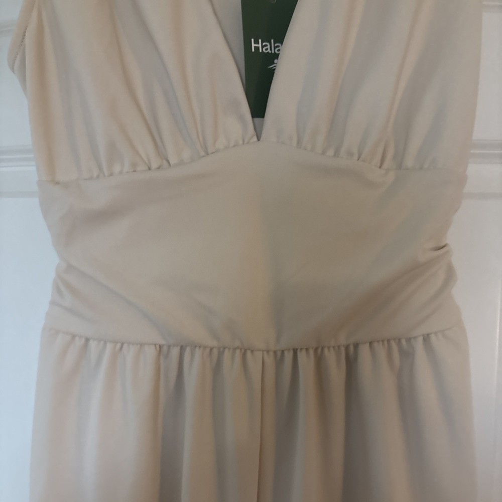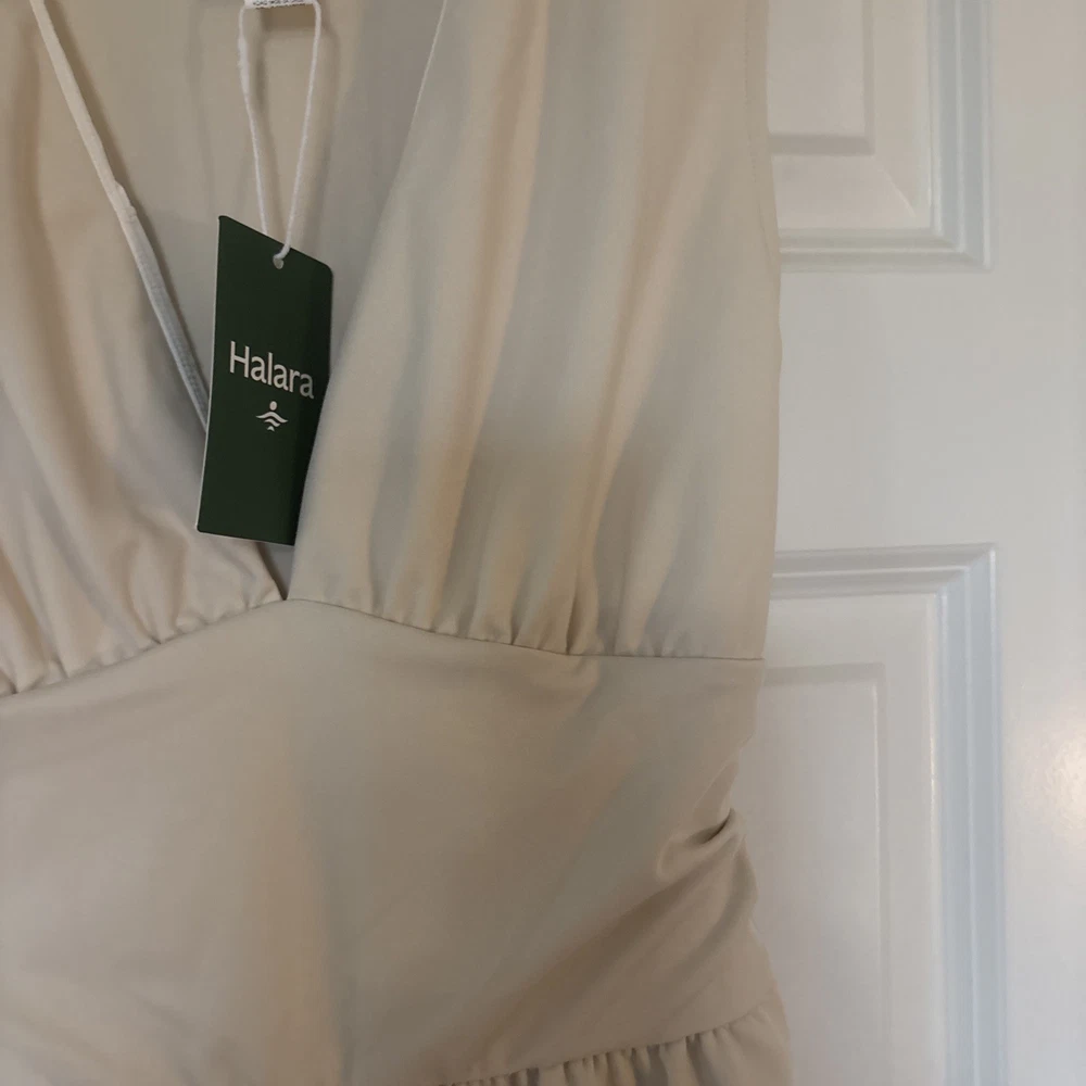The product is a halara off white jumpsuit in women's size medium, featuring a sleeveless design with a V-neckline. It is a one-piece garment perfect for casual occasions, made of polyester material that is machine washable. This ivory jumpsuit has a wide-leg style, ideal for the summer and spring seasons. It is a stylish and versatile option for any woman's wardrobe, representing the brand's standard size and regular fit.