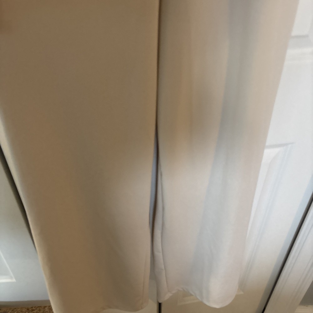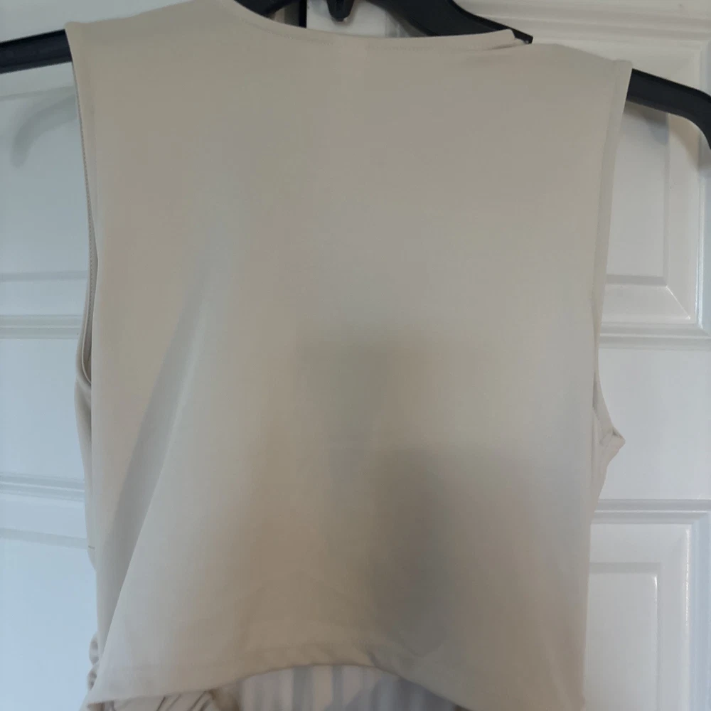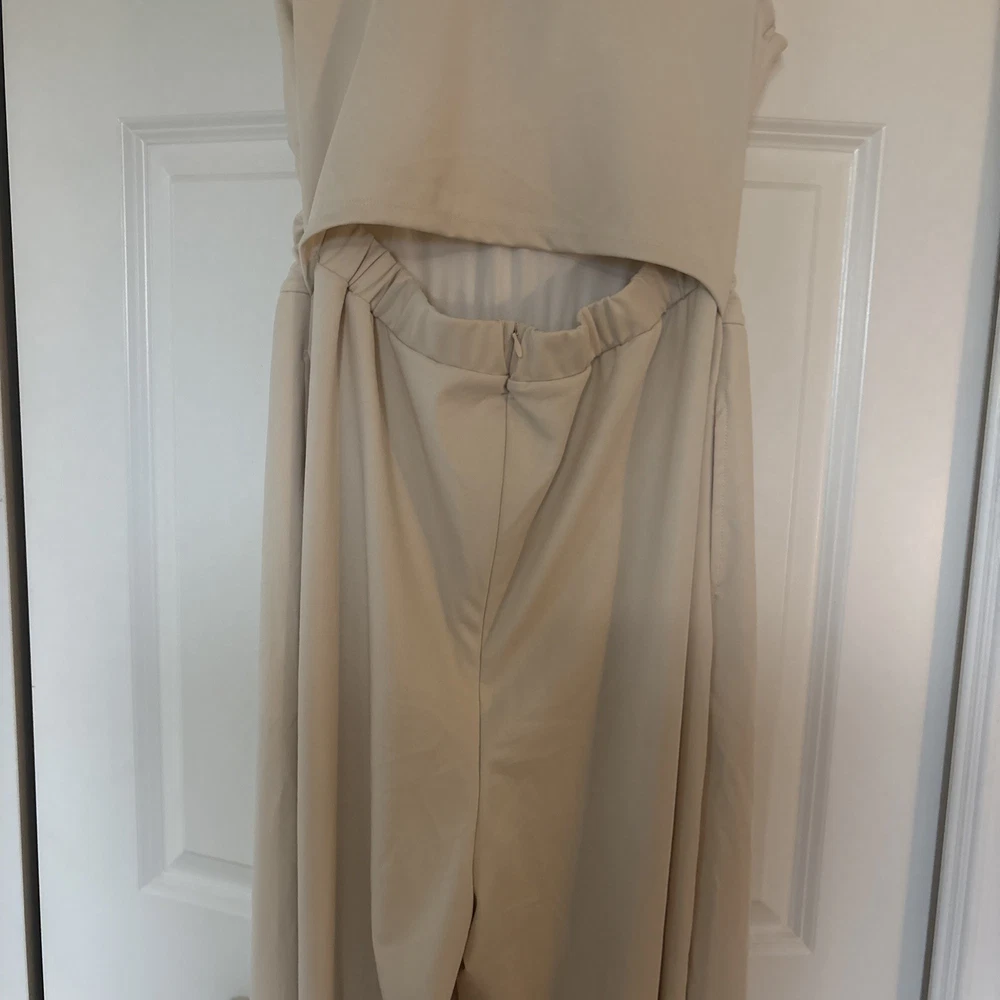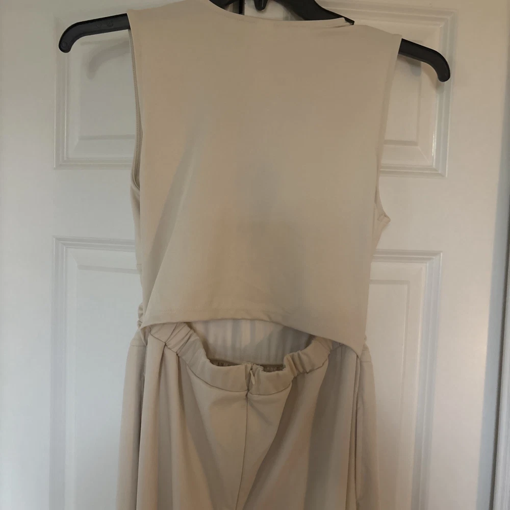 The product is a halara off white jumpsuit in women's size medium, featuring a sleeveless design with a V-neckline. It is a one-piece garment perfect for casual occasions, made of polyester material that is machine washable. This ivory jumpsuit has a wide-leg style, ideal for the summer and spring seasons. It is a stylish and versatile option for any woman's wardrobe, representing the brand's standard size and regular fit.
