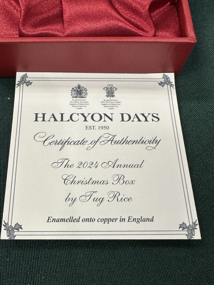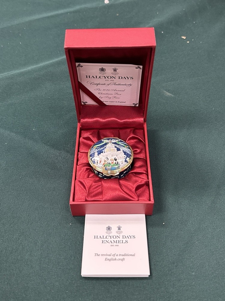 The Halcyon Days 2024 Annual Christmas Box is a collectible decorative item perfect for storing small treasures or jewelry. With a festive theme, this boxed item is a great way to commemorate the holiday season of 2024. This unique product serves as a special keepsake for any collector, showcasing the artistry and craftsmanship of the year.
