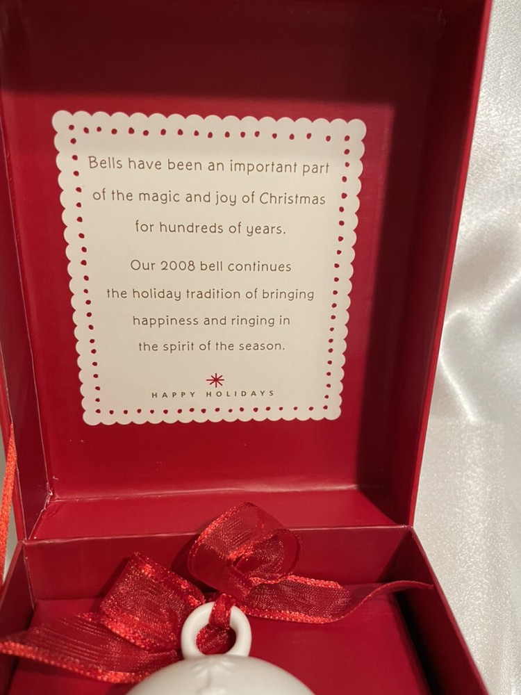 Hallmark Christmas Ornament 2008 White Porcelain Dated Bell w/Box White Porcelain Christmas Bell Dated 2008 Pressed Tin Hallmark Ornament Excellent condition Giftable condition Approx 4" tall I am listing an entire collection of Hallmark hard to find ornaments. Please be sure to check out my other listings and save with a generous combined shipping discount Thank you for considering my auctions! Please email me with any questions. I will respond back quickly. I describe item conditions to the best of my ability and will always point out any flaws or defects that I am aware of. I am an EBay Seller with 100% Positive Feedback! Thank you. Bid with Confidence! See my other listings for more great items! Because I have had a slew of non paying and very slow paying bidders lately I will require payment within 2 days of the end of auction. However, if you need a different arrangement I will be more than happy to work with you, just let me know. INTERNATIONAL BUYERS ARE RESPONSIBLE FOR ALL CUSTOMS CHARGES, PORT CHARGES OR ANY TAXES DUE UPON RECEIPT OF THEIR PACKAGE. All my shipping charges include delivery confirmation. International shipping will be at actual cost. Thank you for bidding on my auctions. Your business is very much appreciated! txzj pxzj3978 txzj-11 txzj44 txzj115