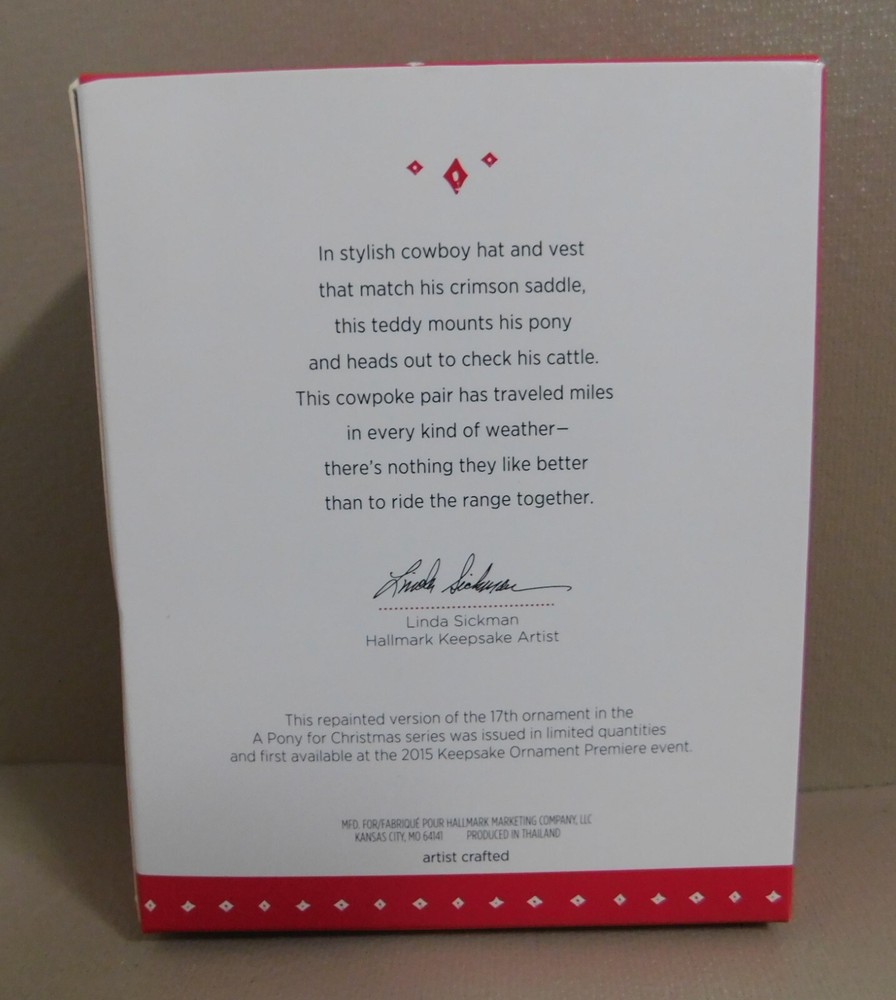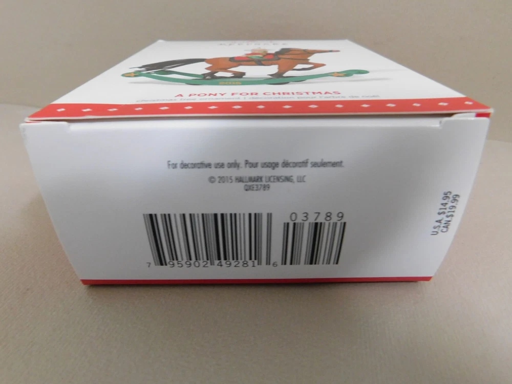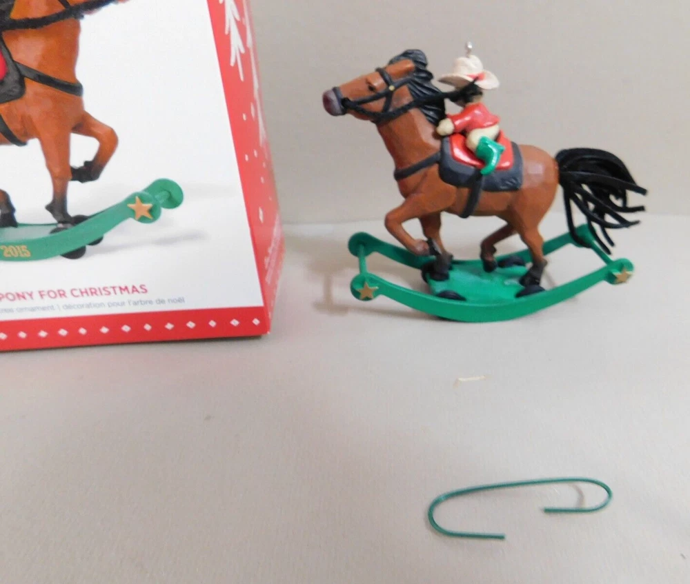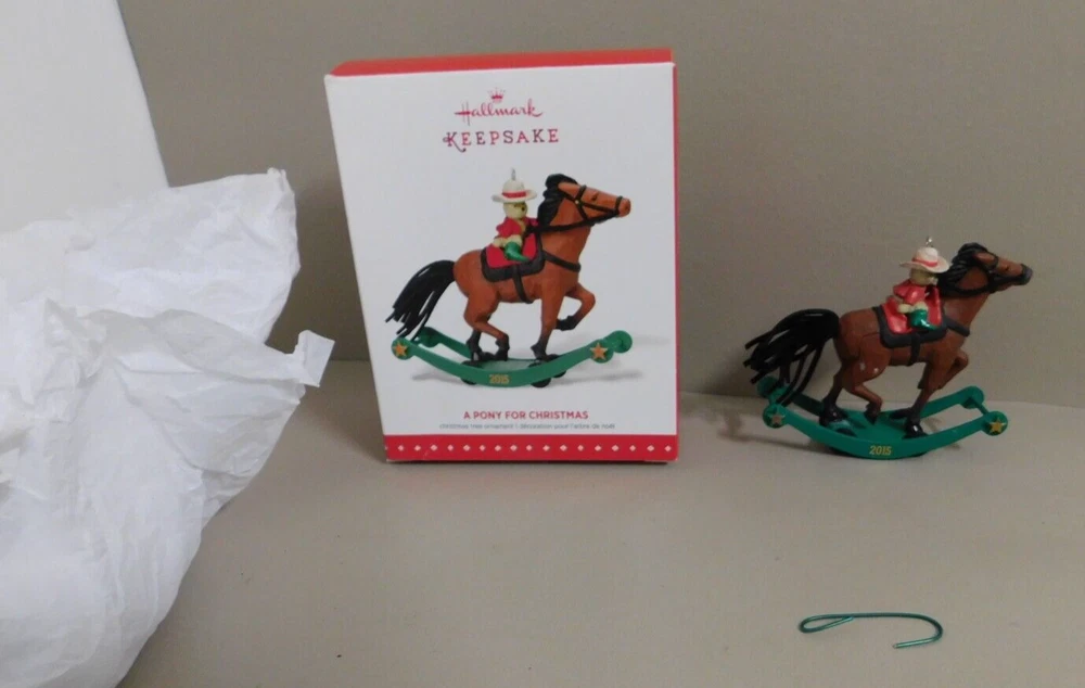 Hallmark Keepsake Ornament A Pony For Christmas, Repaint, Limited Qty., 2015 LE Limited Edition This repainted version of the 17th ornament in the A Pony for Christmas Series was issued in limited quantities and first available at the 2015 Keepsake Ornament Premiere Event Pre-Owned in Good Condition - Appear to may had the rear hoof of horse area reglued to base at some point in its life. - see pictures for actual condition - comes in original box as shown. In Very Good Condition - see pictures Please see all pictures as they are part of the description. This is the actual item that you will receive Please ask any questions prior to purchase I do combine shipping Please check Shipping Details for additional shipping methods offered. Costs may vary depending on your location