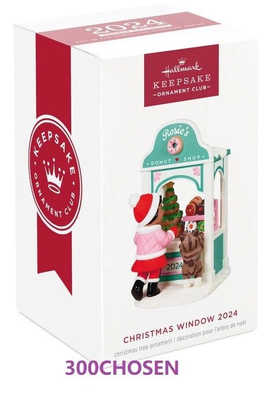 Sweeten the holidays and your Hallmark Keepsake Ornaments collection with the newest shop on the block—Rosie's Donut Shop—crafted by Keepsake artists Nina Aubé and Robert Hurlburt for the 22nd ornament in the Christmas Windows collector's series. A cute little girl and her cat peer inside, smiling at a festive Christmas tree made of stacked donuts and pastries decorated with snowman and reindeer faces. Glistening with glittery snow accents, this KOC member exclusive Christmas tree ornament is sure to brighten your holidays. Key Features: 22nd in the Christmas Windows Keepsake Ornament series. Message: Rosie's Donut Shop. 2024 Additional Details: Artist-crafted by Nina Aubé and Robert Hurlburt. Christmas tree ornament features hanger attachment. Includes: One 2024 Keepsake Ornament in gift box for easy gift giving, preservation and storage. Approx. Size in Inches: 2.4 x 4.32 x 2.39