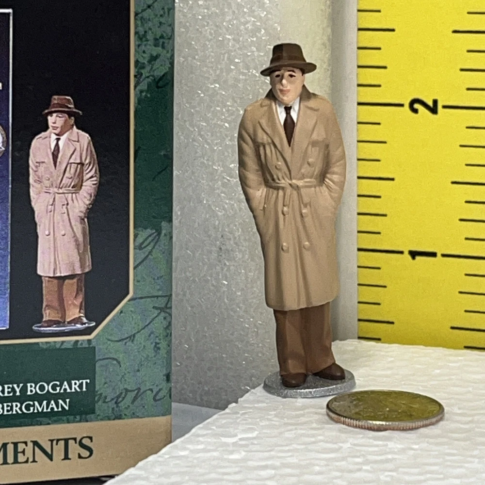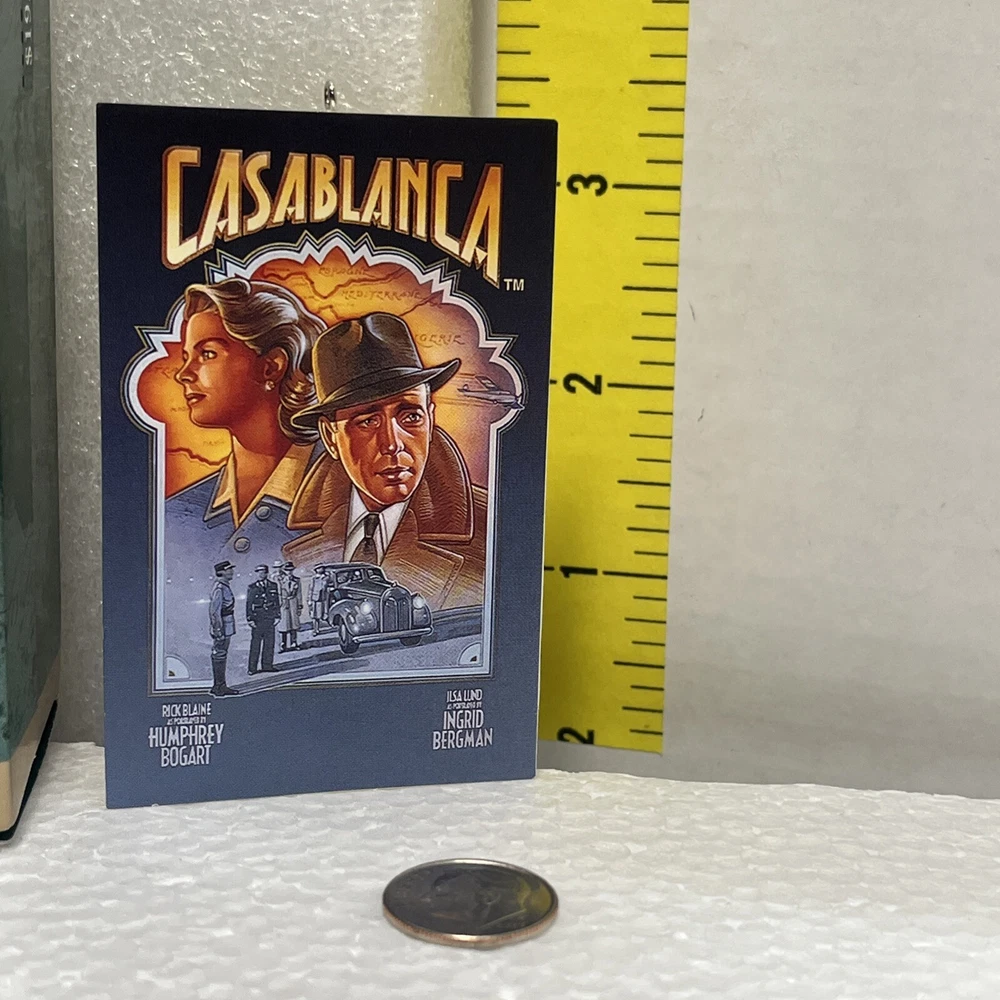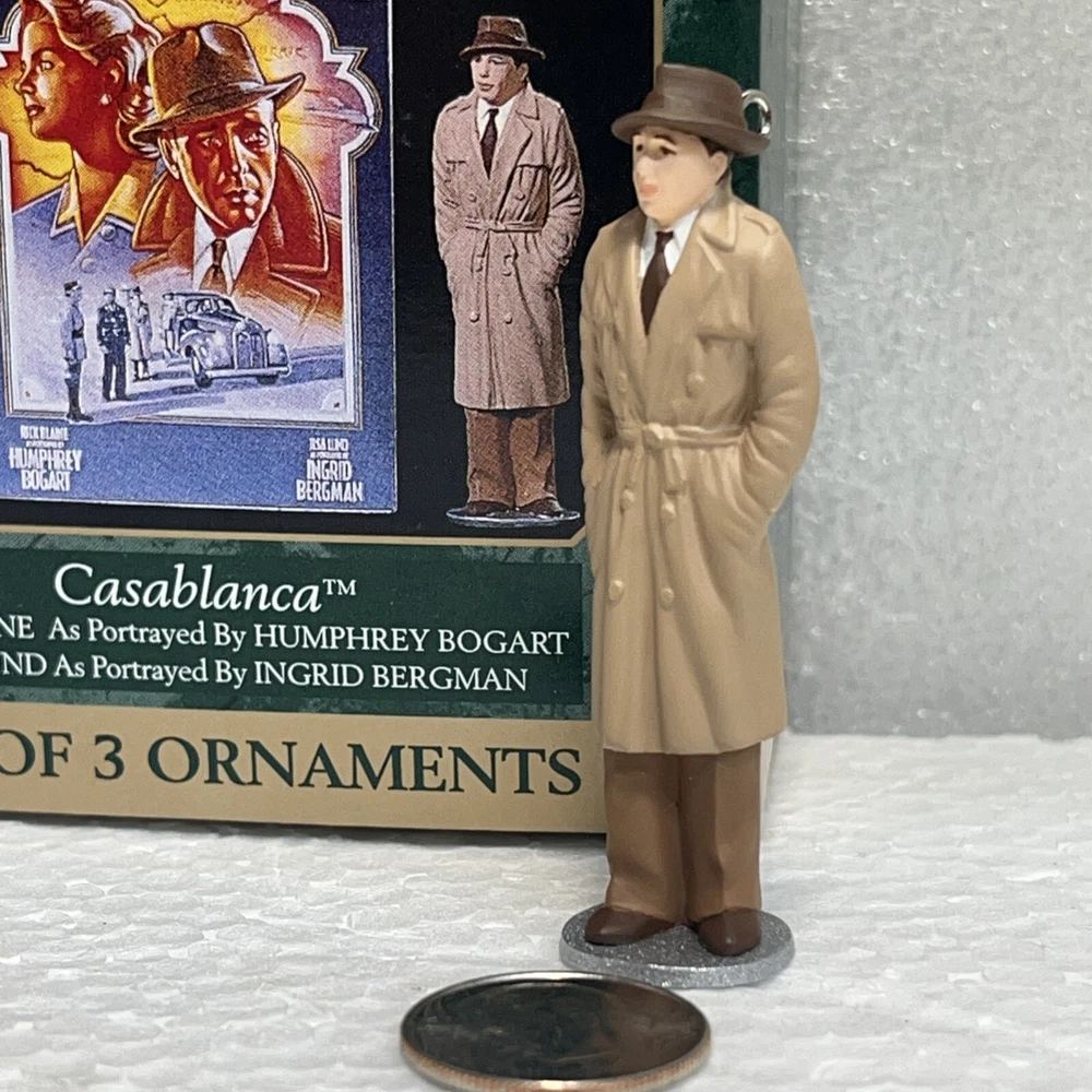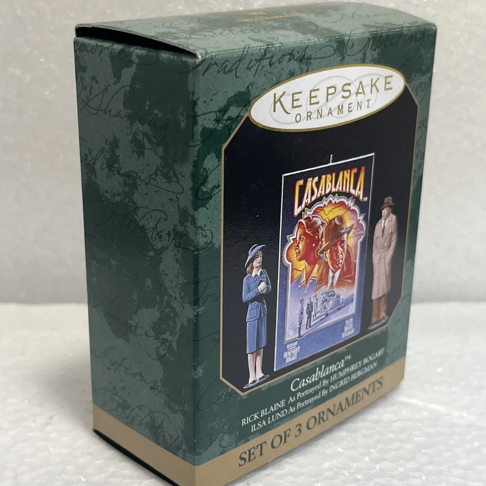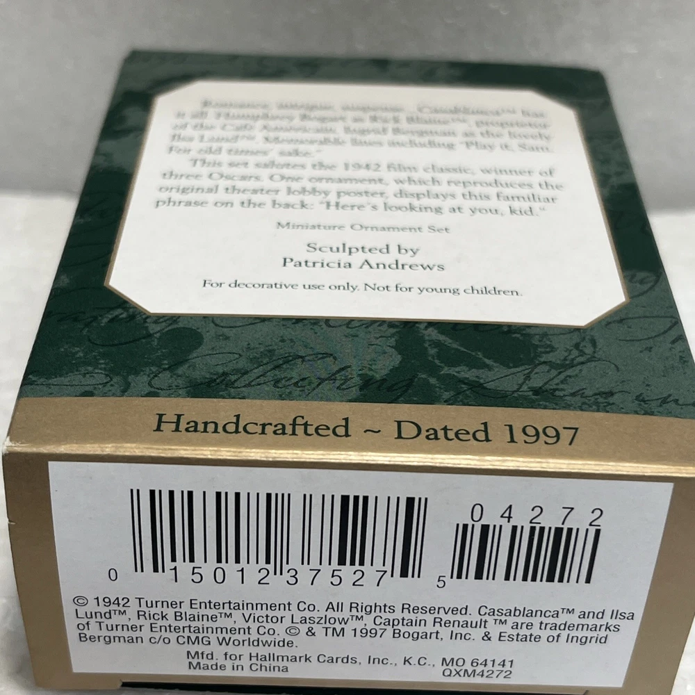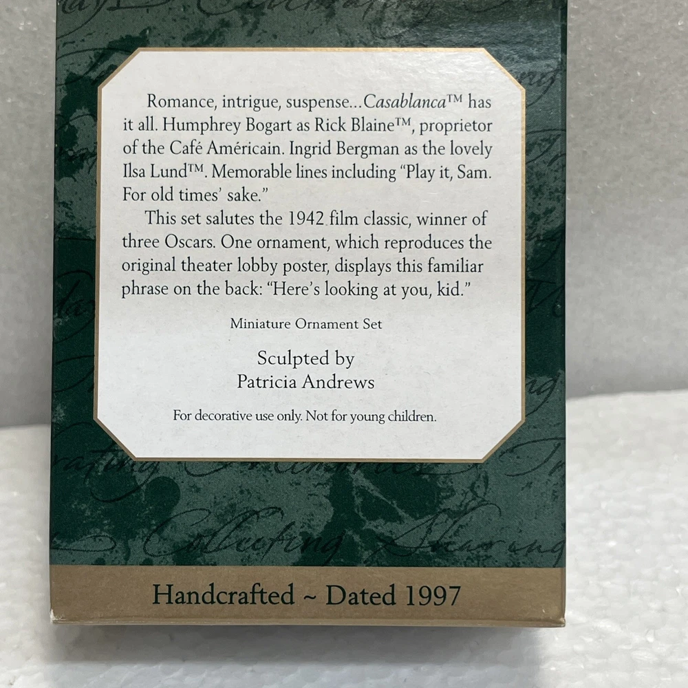 Hallmark CASABLANCA Miniature Ornament Set of 3 Bogart Bergman Poster Hallmark Artist, Patricia Andrews , sculpted this teeny, tiny Miniature Ornament Set in 1997. It features the famous characters from the Classic 1942 film, CASABLANCA. The 3 miniature set includes: Humphrey Bogart as Rick Blaine , proprietor of the Cafe Americain, Ingrid Bergman as lovely Ilsa Lund, "Play it, Sam. For old times' sake", and the reproduction of the original theater lobby poster, with the familiar phrase,... "Here's looking at you, kid." Condition is Brand New stock, Very Good. Box Condition is Very Good to Near-Mint. * See ITEM SPECIFICS in the listing above, as well as photos of this actual ornament and the ornament box. Ships: USPS Ground Advantage