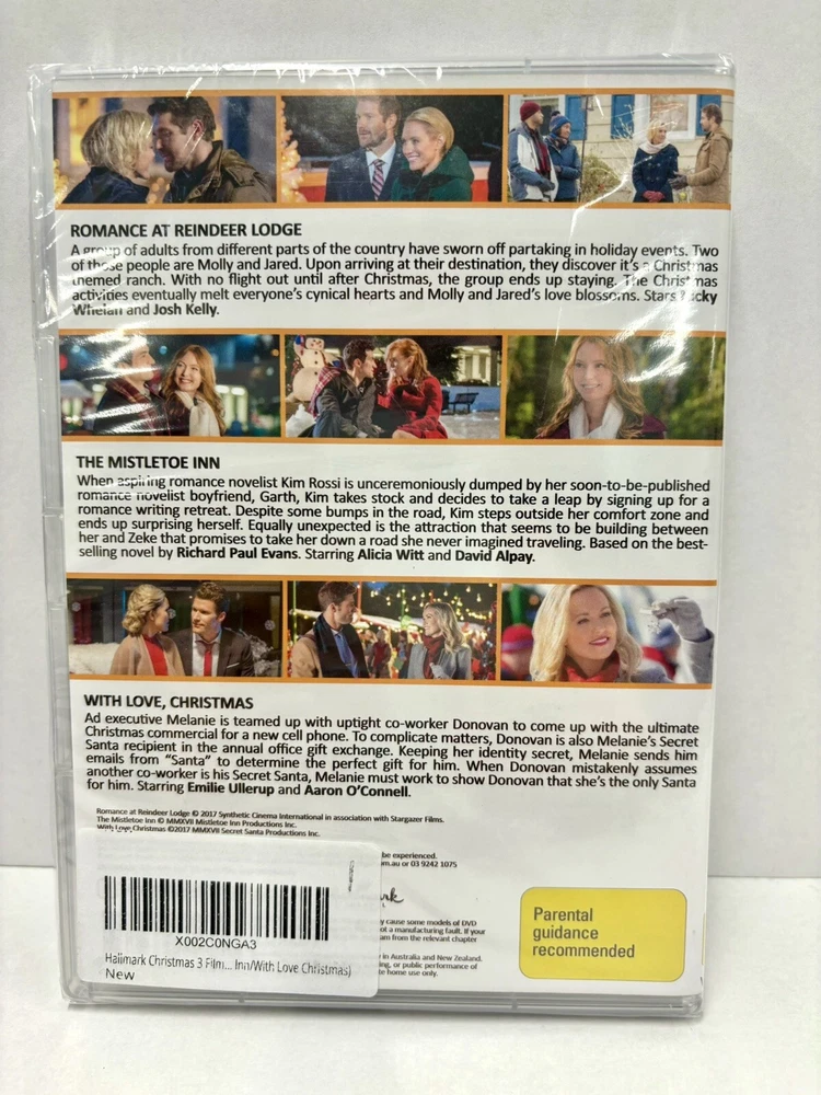 Get into the holiday spirit with this Hallmark Channel Original DVD Triple Feature. This set includes three never-opened DVDs, each filled with festive cheer and holiday spirit. Enjoy the heartwarming stories of love and joy, perfect for the whole family to enjoy. Hallmark Originals Include: Romance At Reindeer Lodge The Mistletoe Inn With Love, Christmas