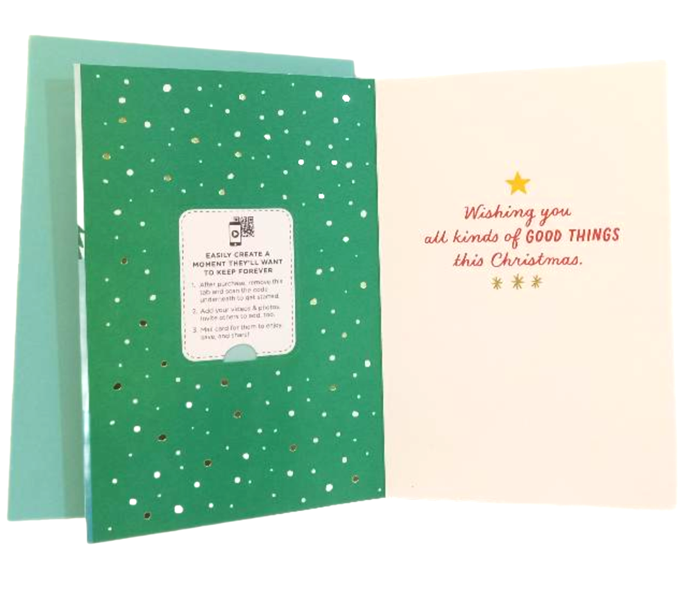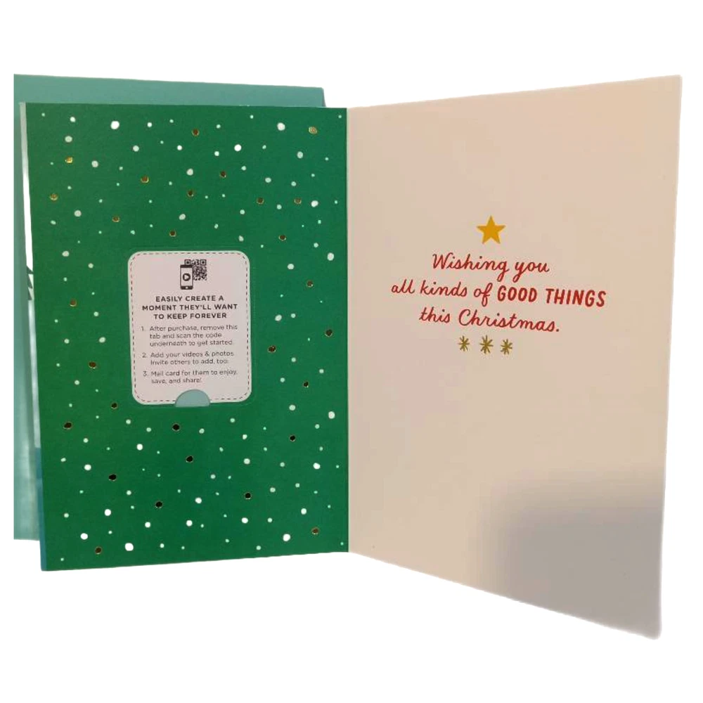 Hallmark Christmas Video Greeting Card Green Gold Joy Love Peace Happiness The Hallmark Christmas Video Greeting Card is a thoughtful and contemporary Christmas card featuring a green, gold, and white color scheme. This multipurpose card includes an envelope and is designed for women who appreciate a festive holiday scene. With the brand's reputation for quality and sentimental messages, this all-occasion card is sure to spread joy, love, and peace during the holiday season. Made in the United States, this card is a perfect choice for anyone looking to send warm wishes to loved ones during Christmas. *** Item Descriptions *** Brand - Hallmark Condition - New Color - Green, Gold, White Type - Video Greeting Christmas Card Theme - Christmas Holiday Scene Recipients To - Multipurpose UPC# - 009200914797