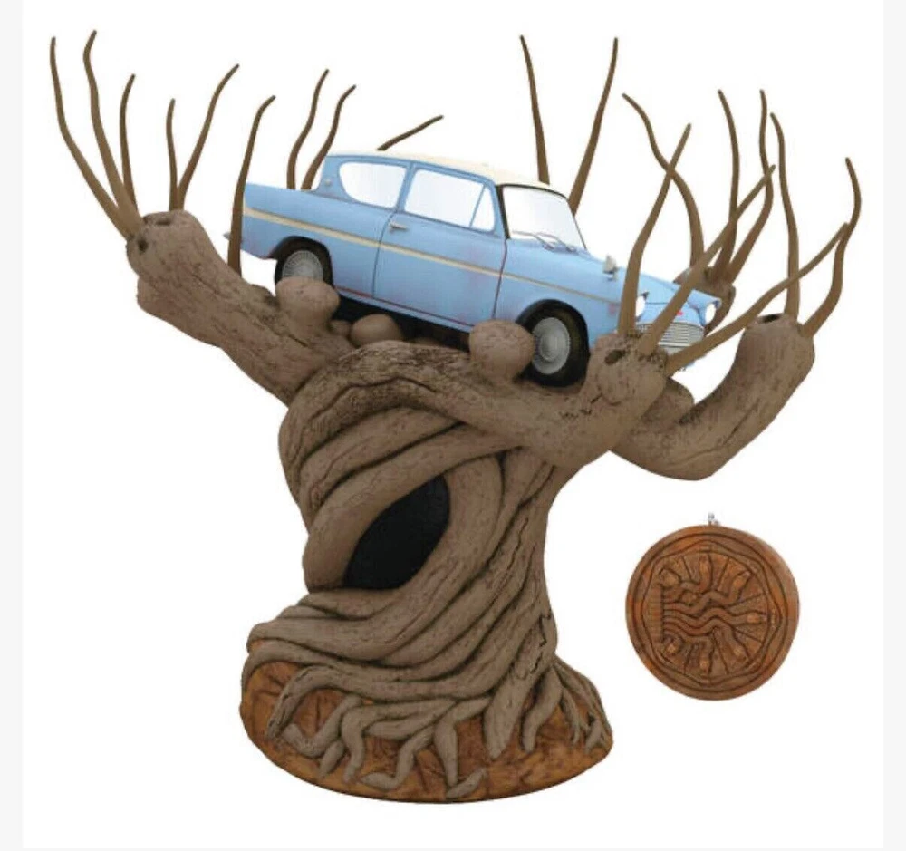 When Harry and Ron are surprisingly blocked from entering Platform Nine and Three-Quarters, they decide to "borrow" Mr. Weasley's Flying Ford Anglia to travel to Hogwarts. Relive the mystery and adventure that fills Harry Potter's second year at Hogwarts School of Witchcraft and Wizardry with this Christmas tree topper featuring the enchanted blue sedan trapped in the branches of a Whomping Willow tree. Plug it into the included power adapter for constant illumination, then press the button—either on the included Chamber of Secrets Door remote control or on the back of the tree topper—to start a sound and light scene from the movie. Connect one or more Harry Potter and the Chamber of Secrets Storytellers ornaments—Harry Potter, Dobby, Ron Weasley and Hermione Granger (each sold separately)—to unlock additional exclusive performances that you can't access with the ornaments alone! Key Features: Connect the Storytellers Interactive Light and Sound tree topper to the power adapter (included) to see a continuous light effect. Press the button on the remote to watch it perform a scene. Add other Harry Potter and the Chamber of Secrets Collection ornaments to unlock larger, amazingly interactive performances. Tree topper plays memorable dialogue from "Harry Potter and the Chamber of Secrets." Requires DC 5 volt 0.7A power adapter (included) that plugs into a standard 120-volt wall outlet. Remote control requires two (2) LR44 replaceable batteries (included)