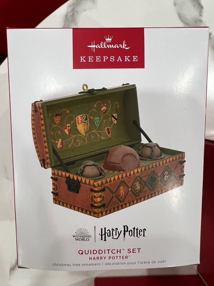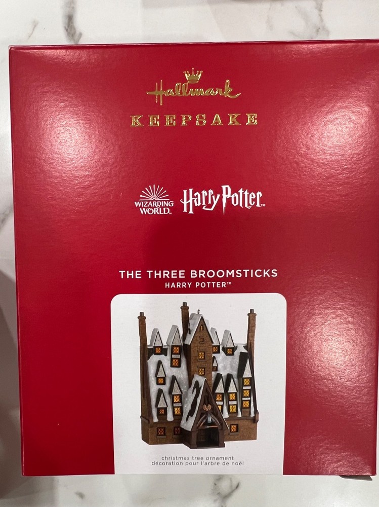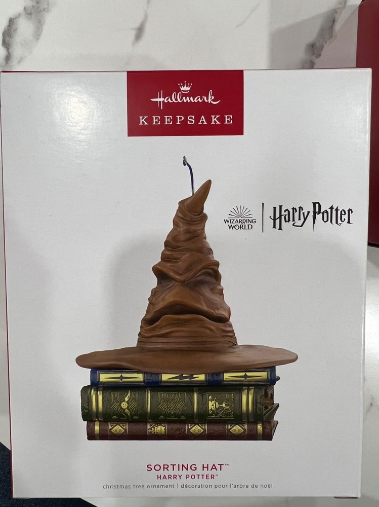 The product is a Hallmark Harry Potter ornament set that includes a Sorting Hat, inspired by the iconic item from the Harry Potter series. The set is part of the Three Broomsticks Borgin Burkes Quidditch collection, specifically designed for fans of the wizarding world. With a festive and magical touch, this ornament is perfect for collectors or fans of the Harry Potter series looking to add a unique and enchanting piece to their decor. And the Harry Potter and the Socerer's Stone.