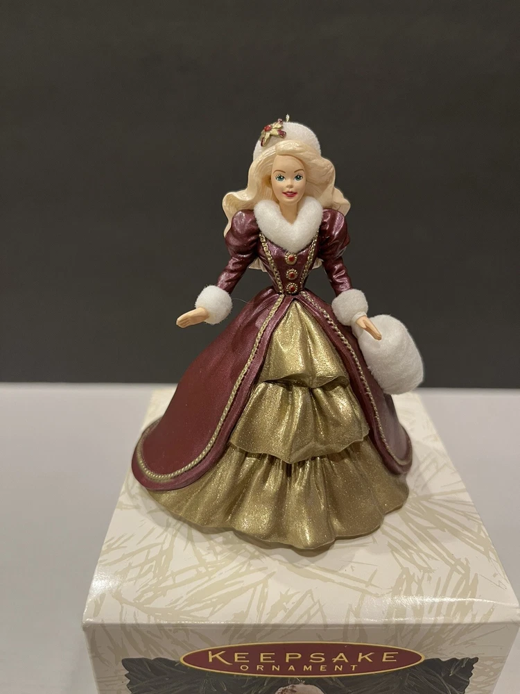 This Hallmark Holiday Barbie ornament is a must-have for collectors. It features the iconic Holiday Barbie character in a festive pose, surrounded by intricate decorations. The ornament is part of the 1996 Collector's Series Keepsake collection, making it a valuable addition to any holiday ornament collection. The ornament is made in China and comes in its original box. It is perfect for display or as a thoughtful gift for any Holiday Barbie fan. Add this beautiful ornament to your collection today! Ornament and box in like new condition