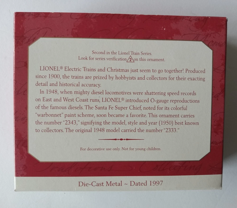 Hallmark Keepsake 1997 Santa Fe 1950 F3 Diesel Locomotive LIONEL Train Die-Cast Metal Christmas Ornament in Original Box with Original Packing Materials. The original box has a few VERY SLIGHT scuffs on some corners but other than that good condition. The train ornament in in perfect condition with no marks, stains, scratches, broken or missing parts. Additional photos upon request. Item will be shipped in safe and secure packaging. Remember, Electric Trains and Christmas just seem to go together.