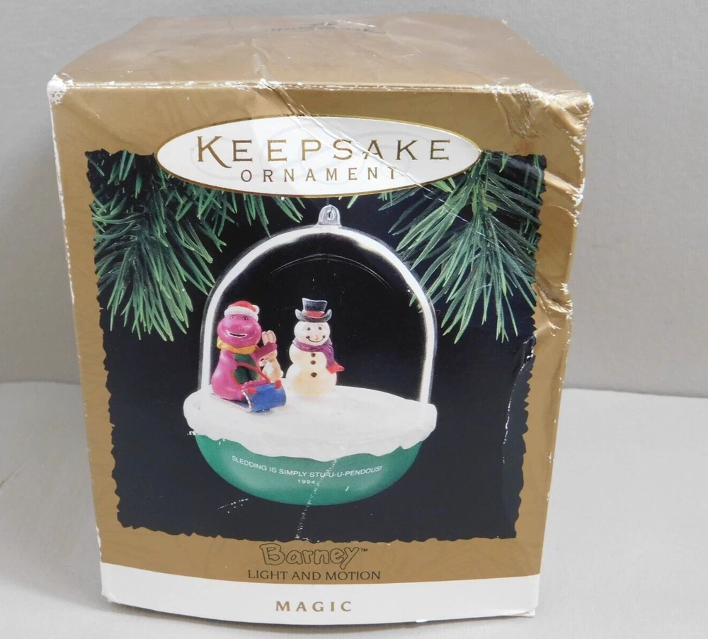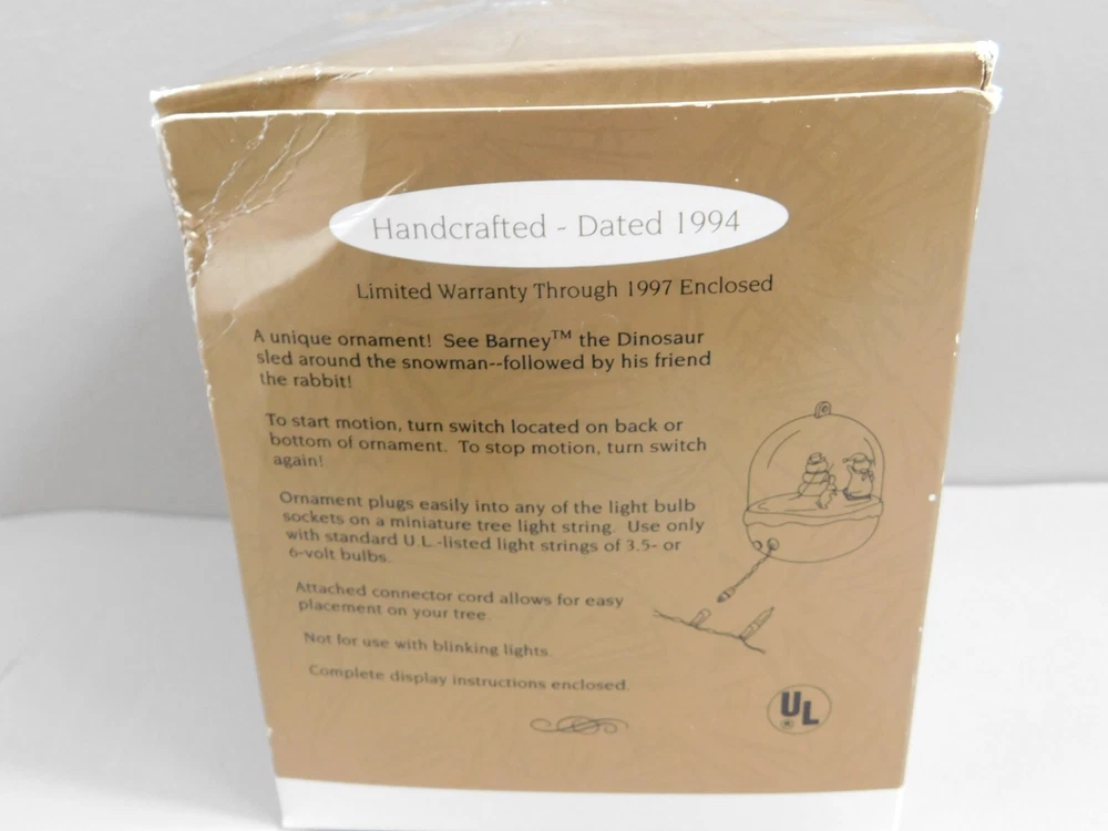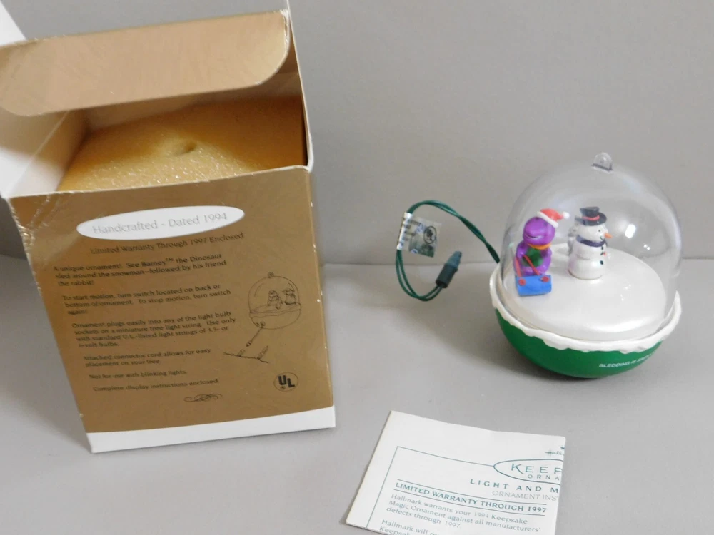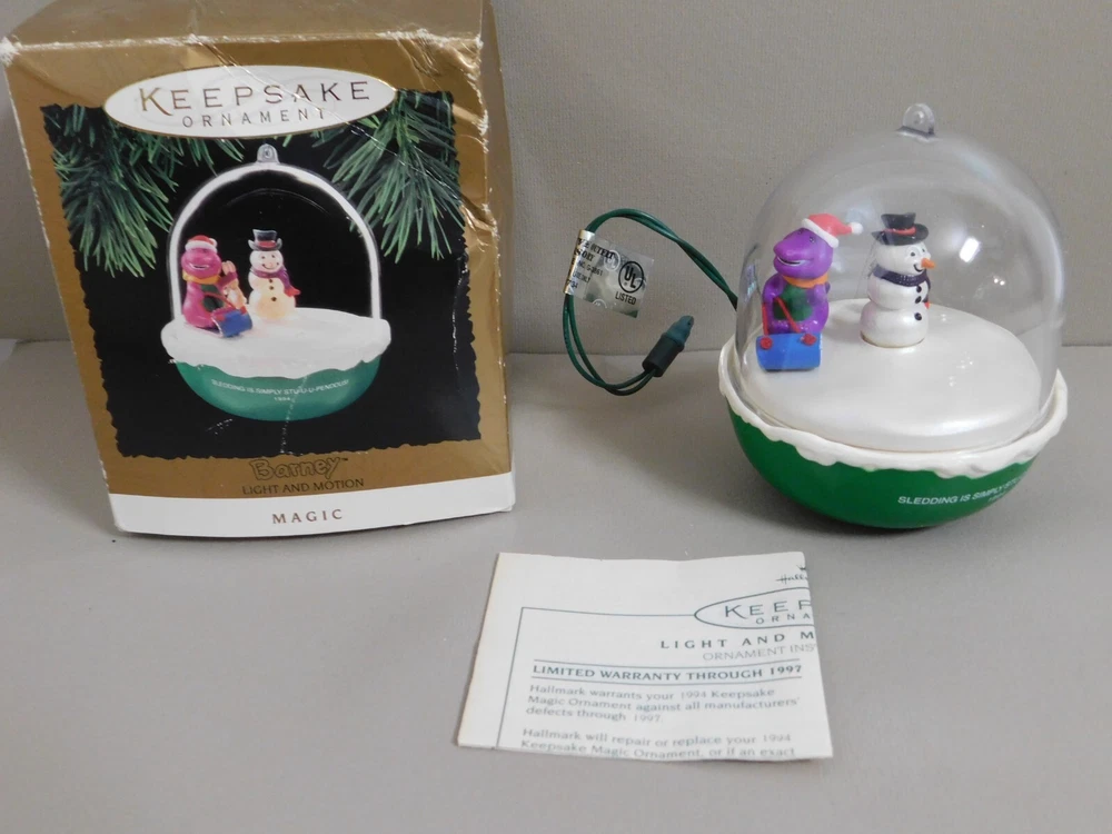 Hallmark Keepsake Christmas Ornament 1994 BARNEY & Snowman Magic Light & Motion Pre-Owned Ornament in Excellent Condition in Original Box. Box has damage and shelf wear. See pictures for Actual Condition. Instructions included for connecting to light bulb socket on miniature tree light string. Please see all pictures as they are part of the description. This is the actual item that you will receive Please ask any questions prior to purchase I do combine shipping Please check Shipping Details for additional shipping methods offered. Costs may vary depending on your location