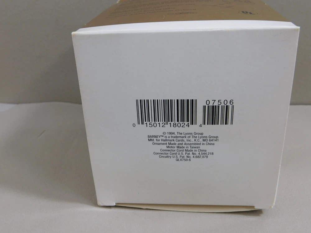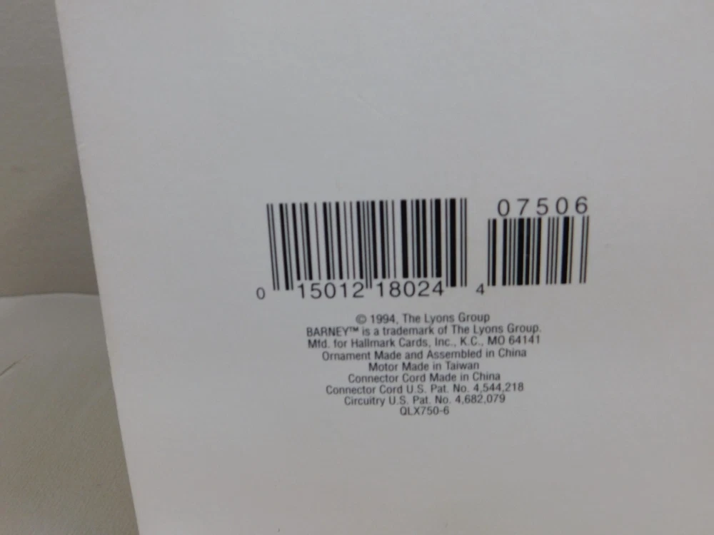 Set Includes: Ornament Franchise: Barney Occasion: Christmas Time Period Manufactured: 1990-1999 UPC: 015012180244 Theme: Cartoon & TV Characters Year Manufactured: 1994 Brand: Hallmark Recipient: Multipurpose Department: Adult Collection: Ornaments Number of Items: 1 Character: Barney Subject: BARNEY gtin13: 015012180244 Material: Plastic Type: Ornament Original/Licensed Reproduction: Original Country/Region of Manufacture: China Color: Multicolor Features: Hanging, Magic Light and Motion Vintage: Yes MPN: QLX7506