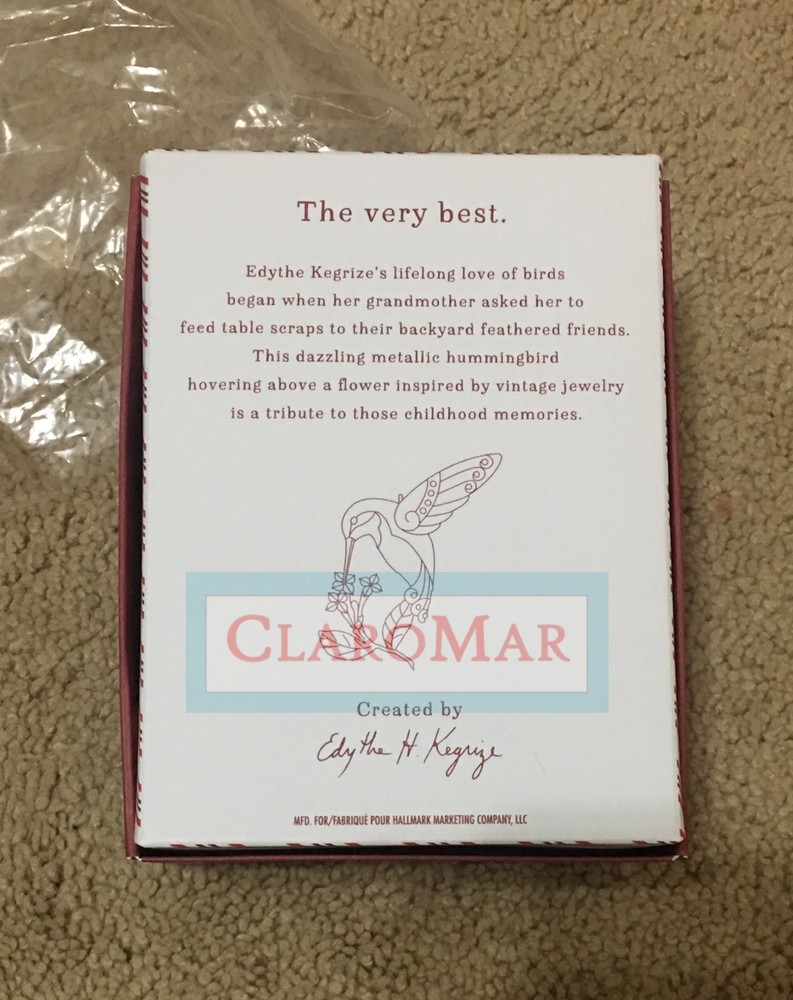 Brand new item from a nonsmoking home. Hallmark Keepsake Dazzling Hummingbird Premium Ornament. Hummingbirds are truly magical. Whether or not you can spot these birds in your backyard, enjoy this dazzling ornament on your Christmas tree. Hallmark Gold Crown Exclusive. Dated 2016. Metal. Ribbon hanger. Pre-packaged for easy gift giving, preservation and storage. 3.25" W x 4.25" H x 1.87" D. Pre-filled product detail is for information purposes only. You will receive the item pictured. Please look at the pictures for greater details. ALL ITEMS COME FROM A NON-SMOKING ENVIRONMENT Any questions, please feel free to email me. Please look at my other items listed for sale. I look forward to working with you and thank you for taking the time to view my listing. International Buyers – Please Note: Import duties, taxes, and charges are not included in the item price or shipping cost. These charges are the buyer's responsibility. Please check with your country's customs office to determine what these additional costs will be prior to bidding or buying. Visit My eBay Store: ClaroMar Track Page Views With Auctiva's Counter