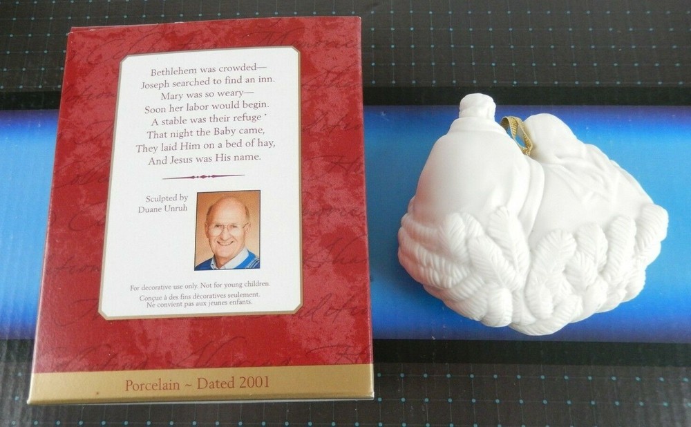 Character:Mary & JosephMaterial:PorcelainColor:WhiteBrand:HallmarkOccasion:ChristmasSeller Notes:“Never Displayed.. Box has minor damage.”Type:OrnamentYear Manufactured:2001