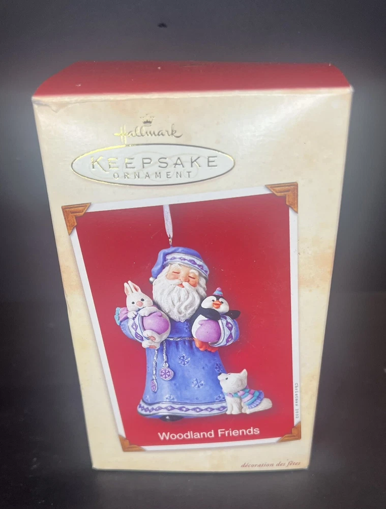 The Hallmark Keepsake Ornament Woodland Friends 2002 features a medium-sized Santa Claus ornament with a multicolor design, part of the Animals collection. It depicts Santa surrounded by various animals, making it a festive addition to any Christmas decor. This vintage ornament from 2002 is made of mixed materials with decorative hanging features, perfect for adding a touch of holiday charm to your home.