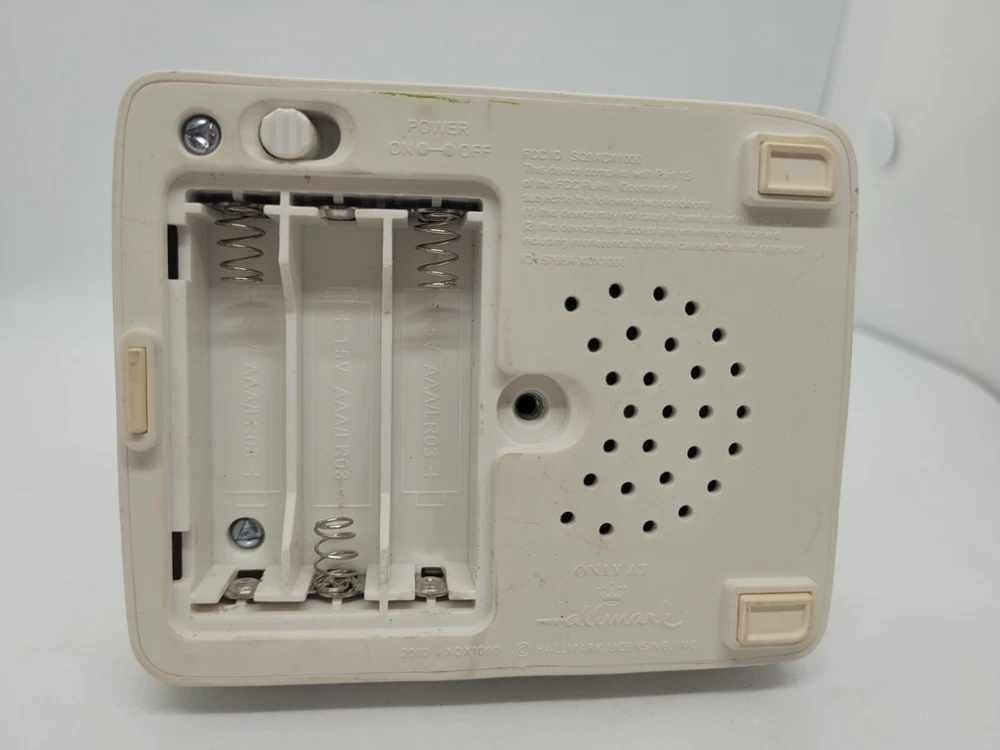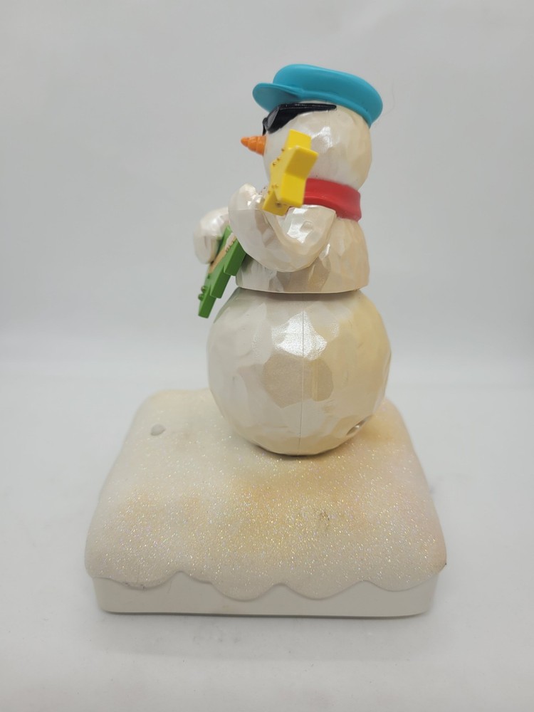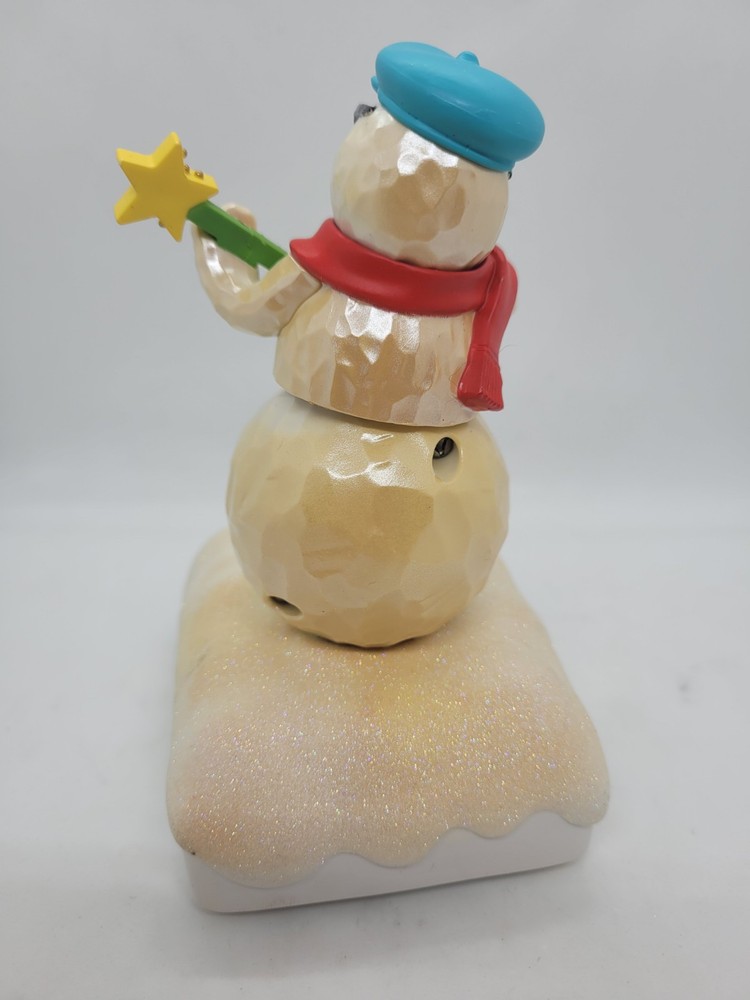 It semi works! When I push the button, it makes sound but it is scratchy sounding and is softer than it should be. Some discoloration on the sparkly snow. It does makes noise and move, just not as well as a new one would. Part of a set sold by Hallmark in 2010. It should connect via Bluetooth with other snowmen in the set, but no guarantees. Plays 2 songs. Sold without batteries. Smoke/pet free home.