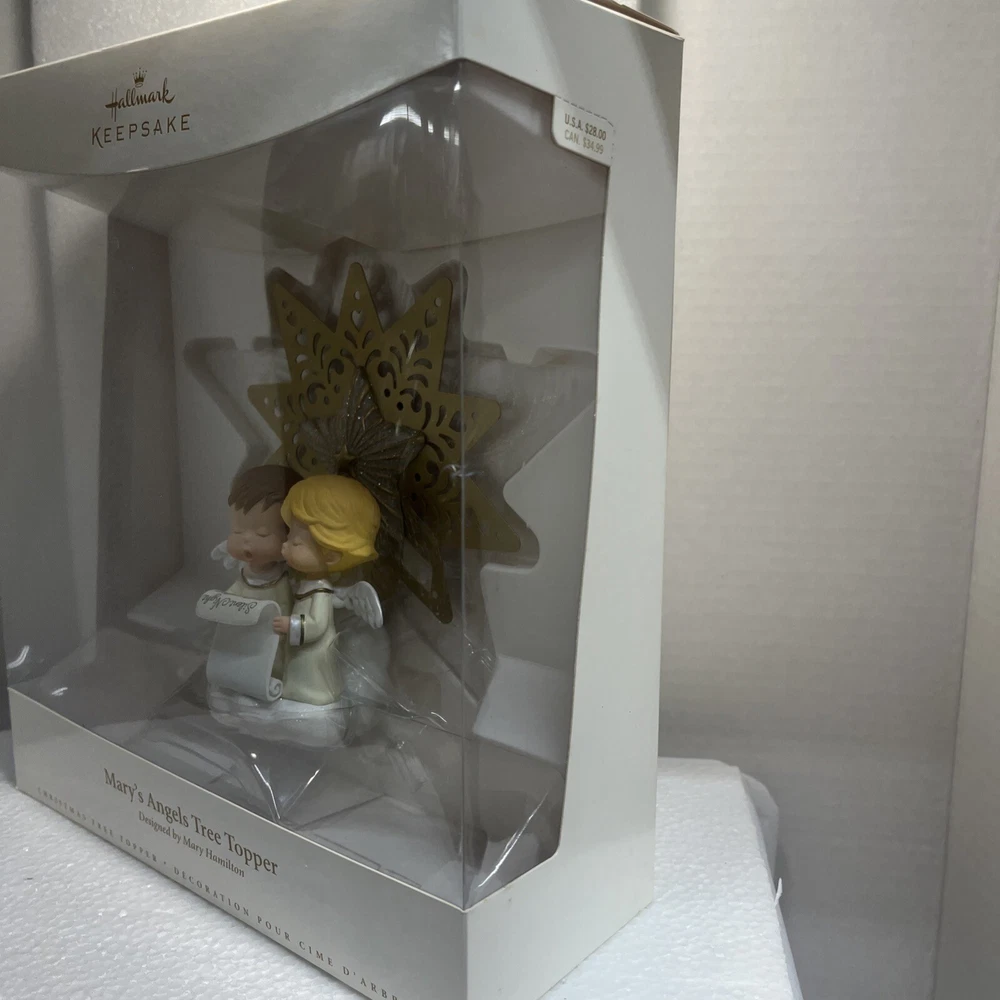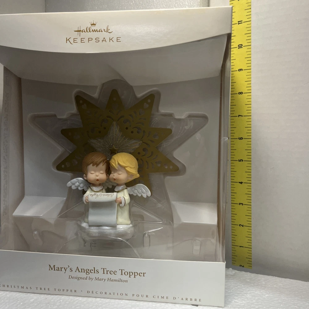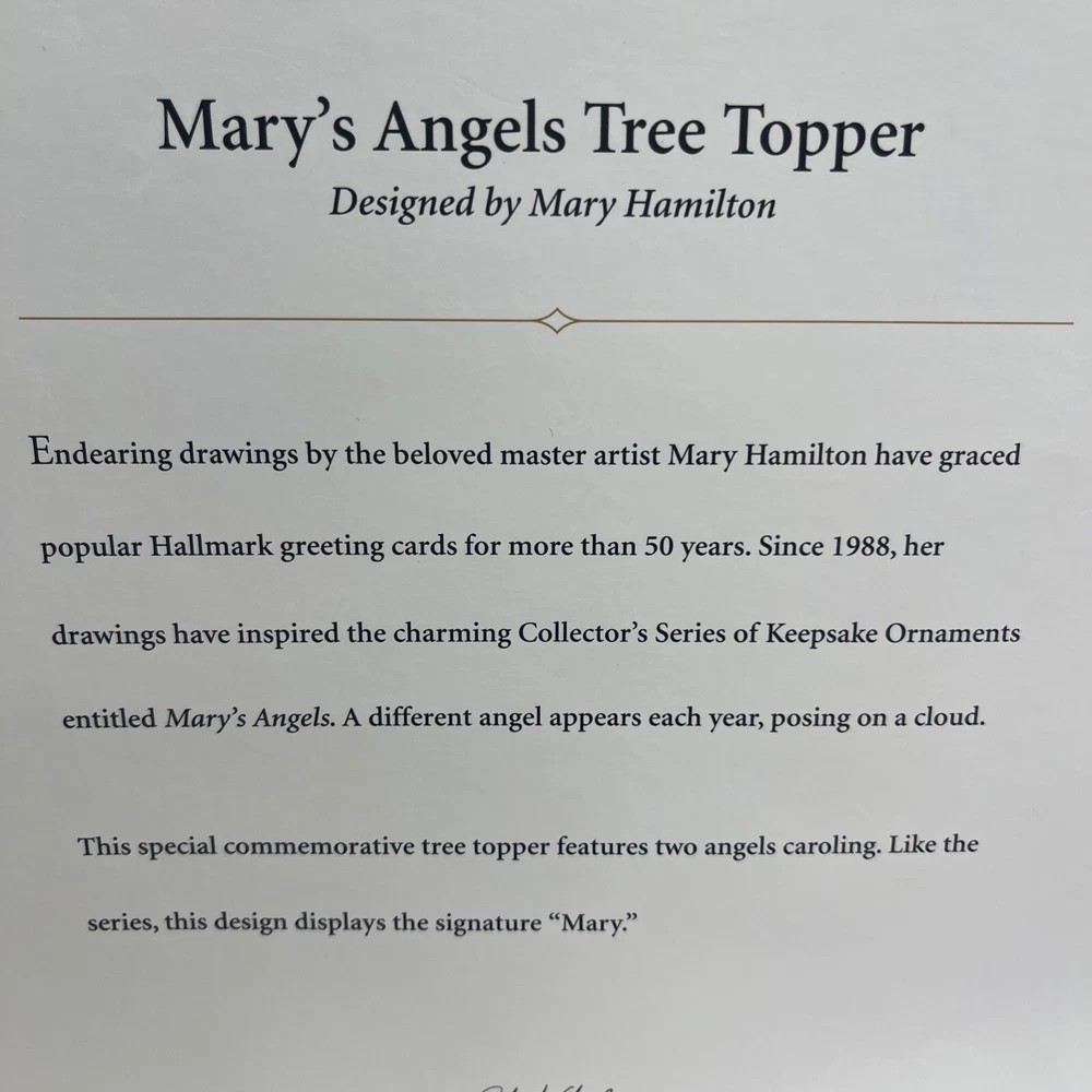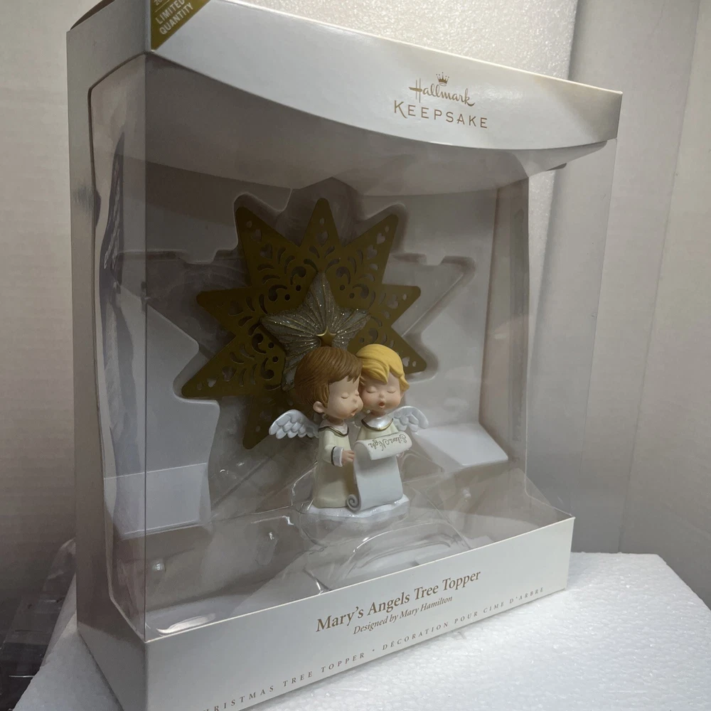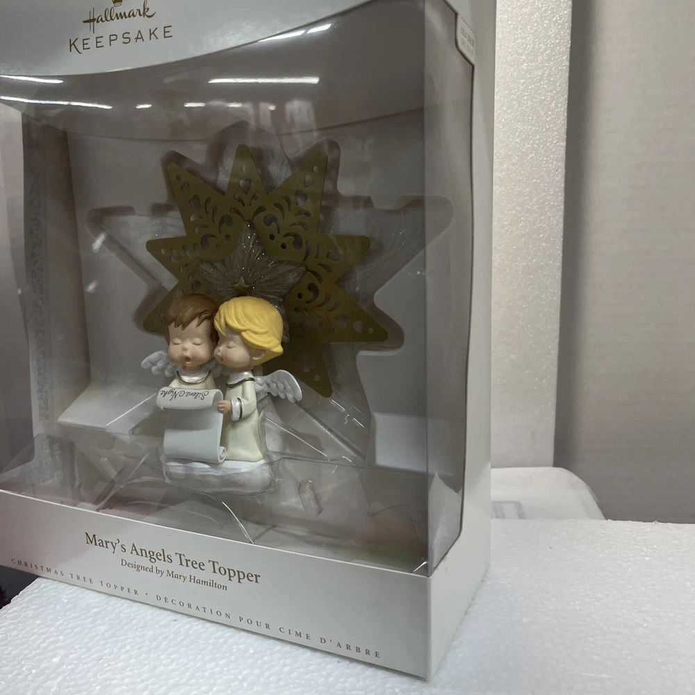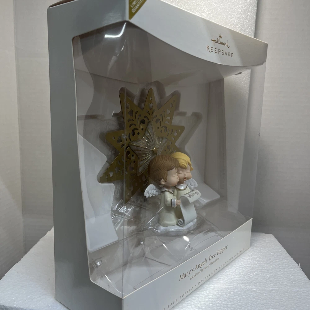 Hallmark Mary's Angels Tree Topper Commemorative Tree Topper Ltd Rare New 2006 Much loved Master Hallmark Artist, Mary Hamilton, created so many beloved angels with her "Mary's Angels" endearing Drawings and Artwork. Her endearing drawings have graced Hallmark cards for more than 50 years. It was Mary's drawings that inspired the Charming Collector's Keepsake Ornament Series, Mary's Angels, which features a different angel each year, posing on a cloud. This Special Limited Commemorative Tree Topper features 2 angels caroling. This design displays the signature "Mary", just like the series. Condition is Brand New. Never out of box. Never Displayed. This item came from a now closed Hallmark Gold Crown Store. It was carry-over stock and has been stored in climate controlled storage. * See ITEM SPECIFICS in the listing above, as well as photos of this actual Tree Topper in it's Box. Ships USPS. Ground Advantage.
