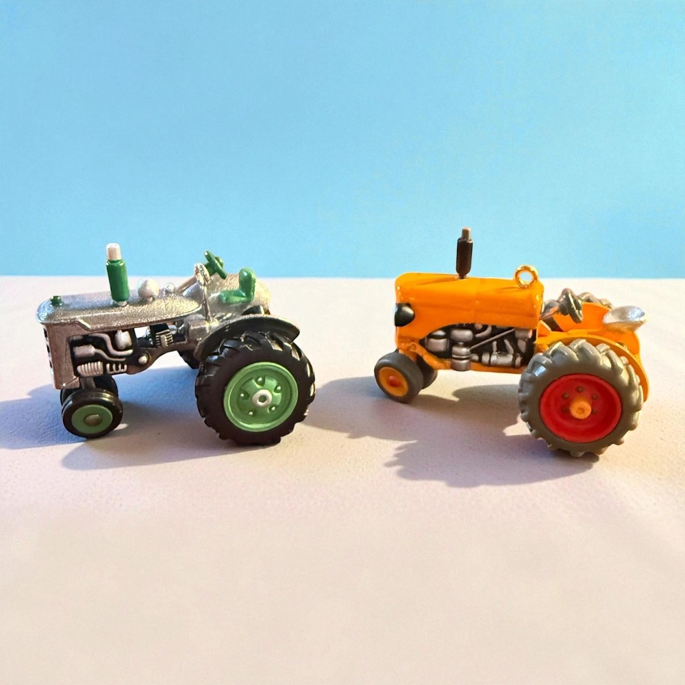 Hallmark Keepsake Ornaments - Miniature Collector's Series. Theme of Antique Tractors. One is from 2003 and the other from 2001. Both are made of die-cast metal. S2-53