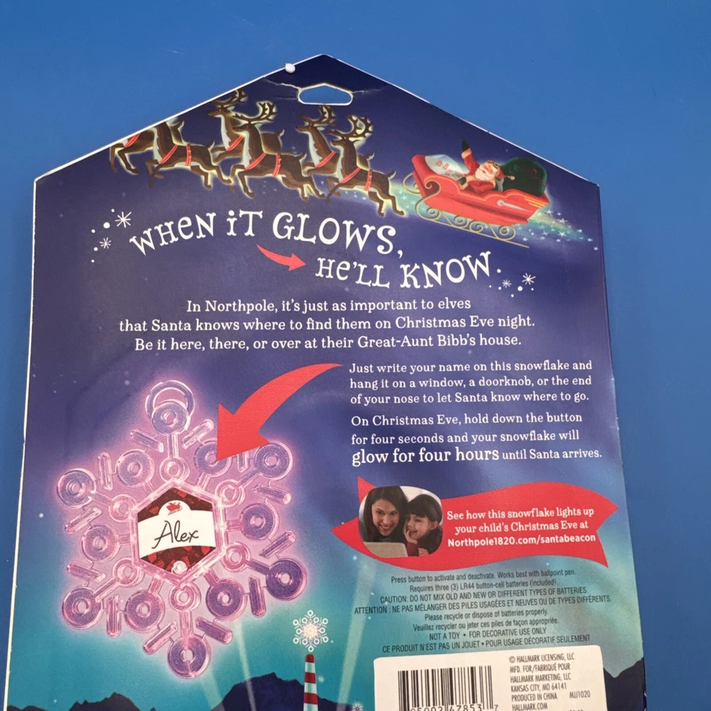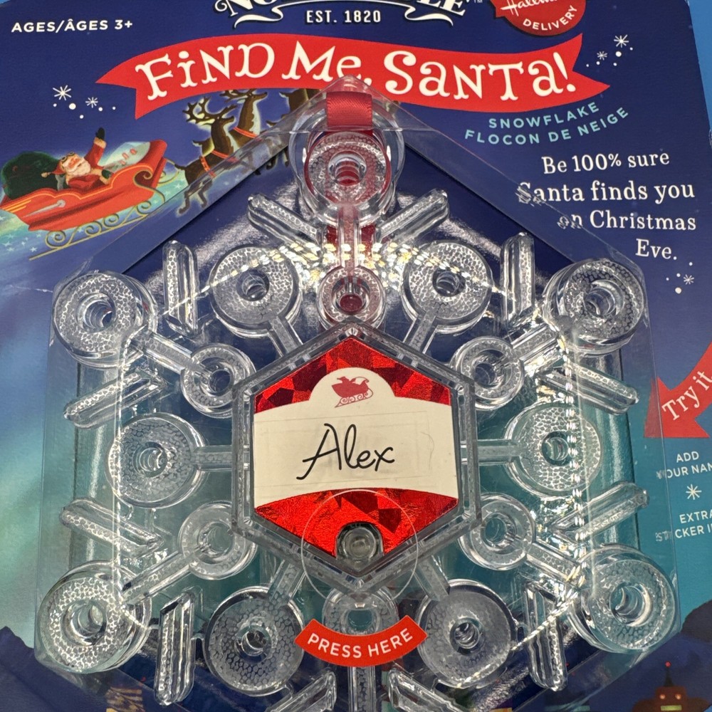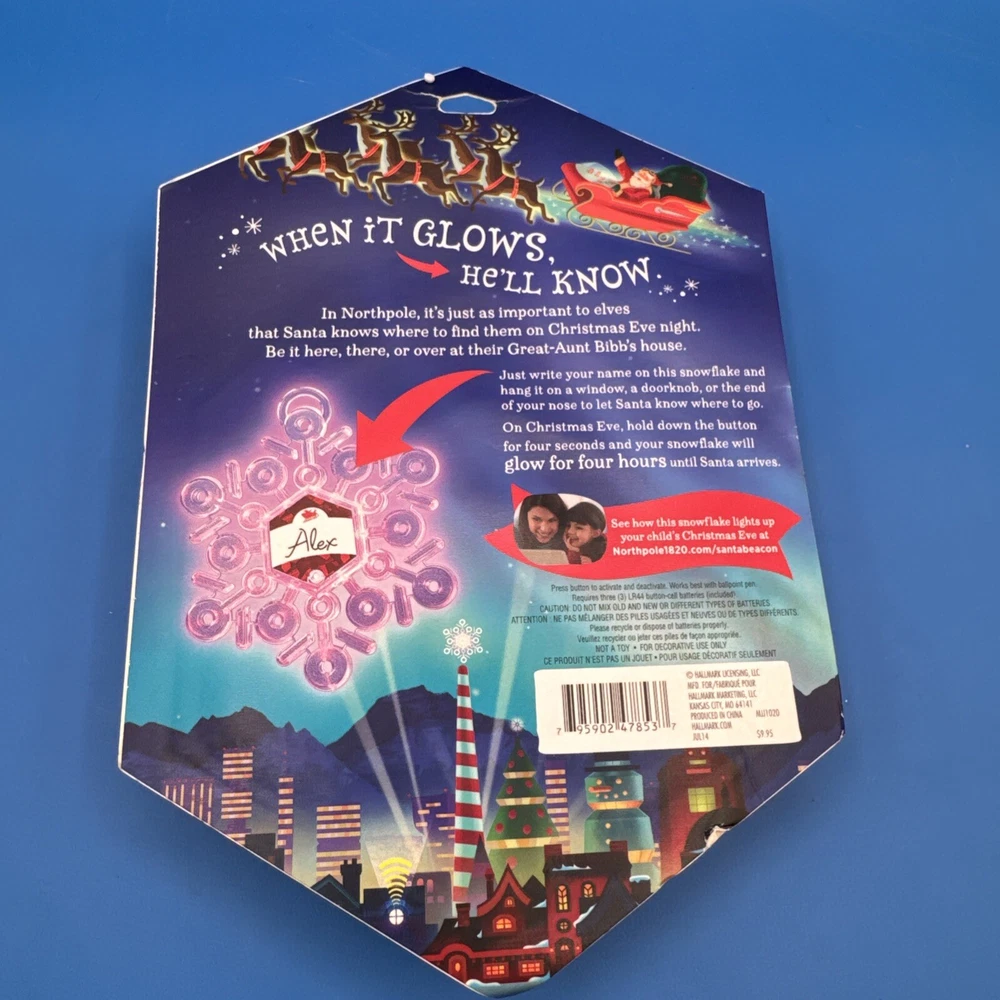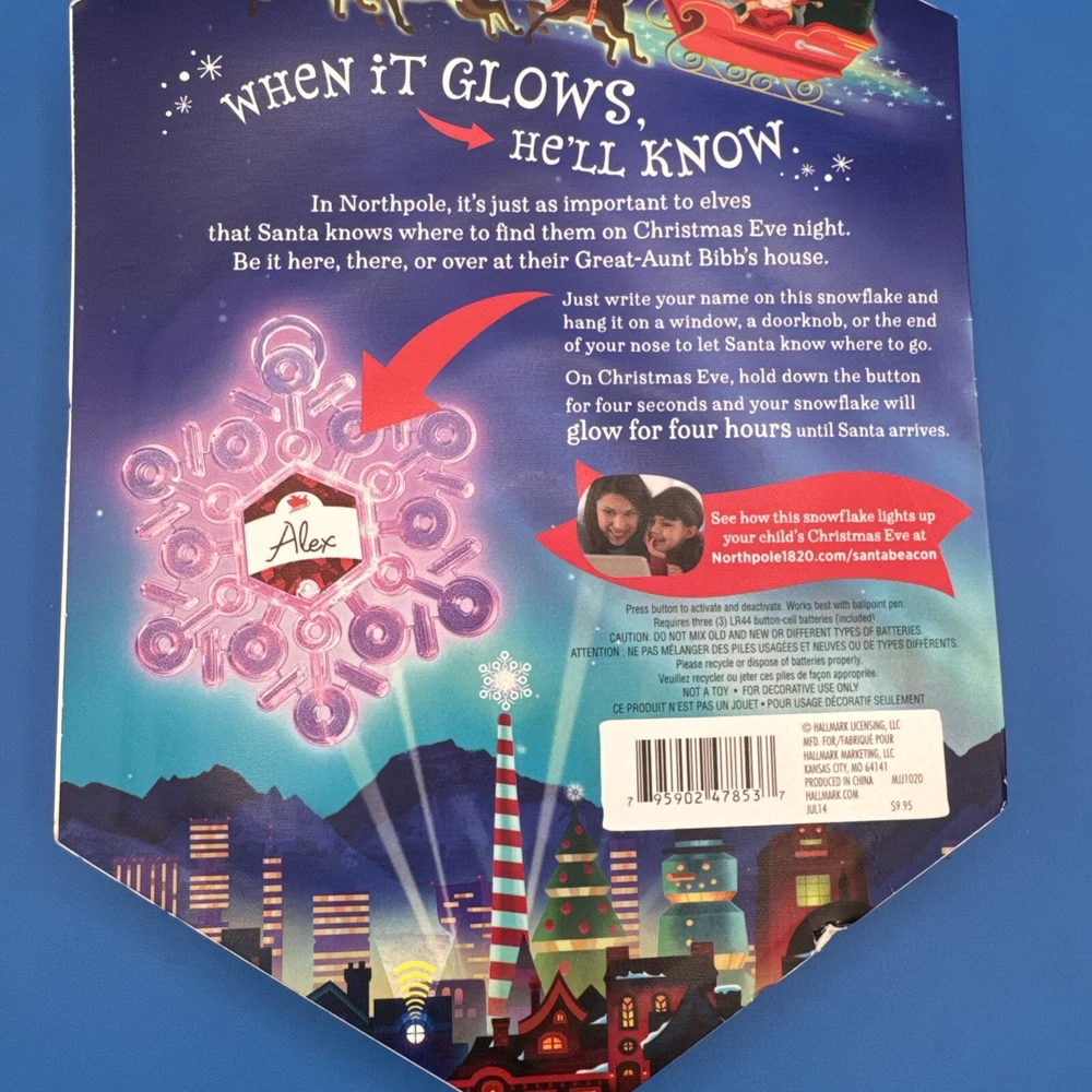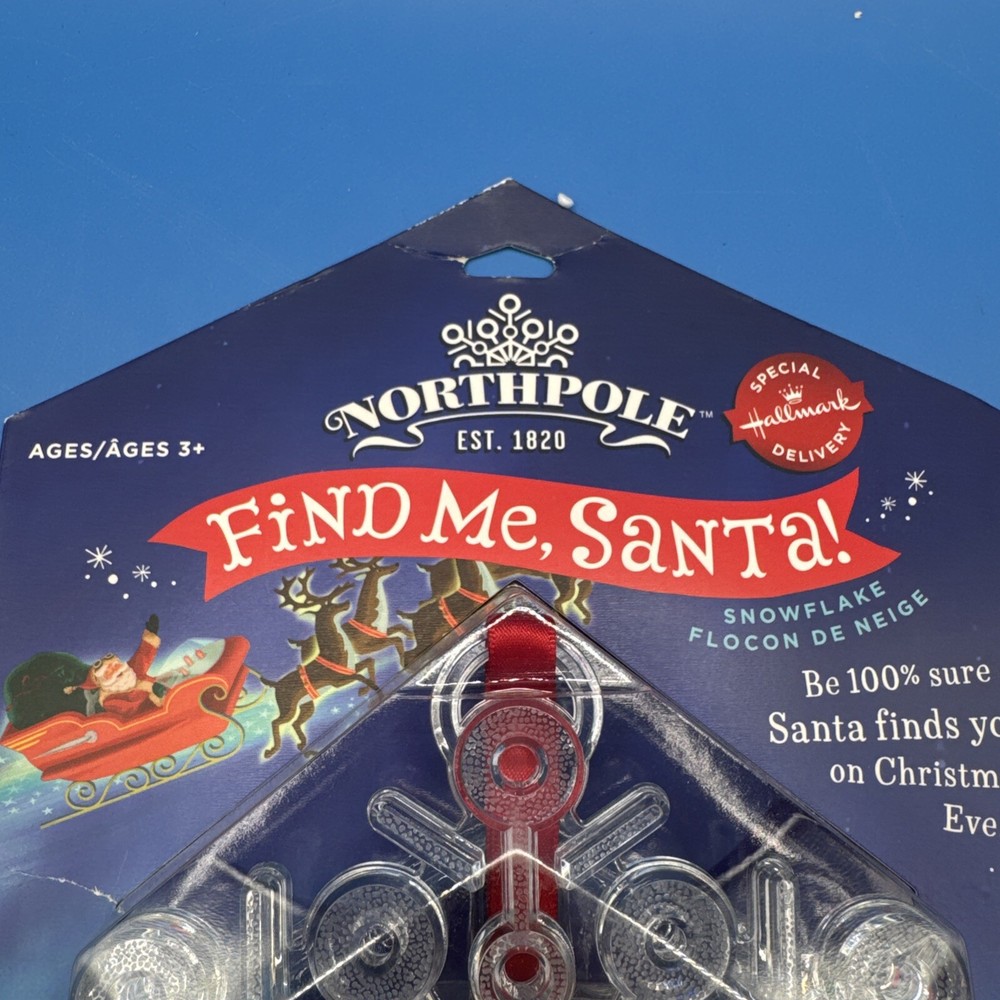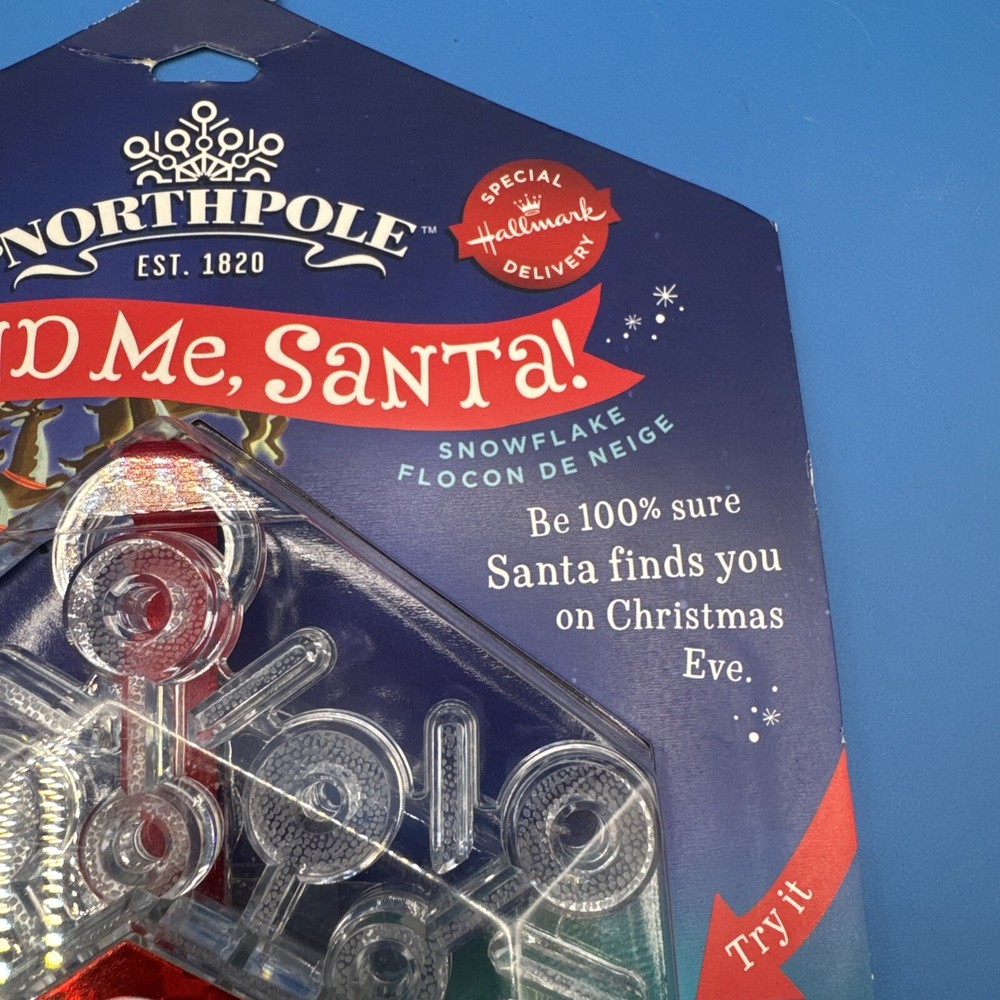 The Hallmark Northpole Find Me Santa Light up Snowflake ornament is part of the North Pole collection and features a plastic snowflake design that lights up. The ornament depicts Santa and is specifically themed for Christmas. It includes lights and is designed to add a festive touch to holiday decorations. Sealed. Never been used. Possible battery replacement. Original box has some curved edges. Please check the pictures carefully as part of the description. Feel free to ask questions if you need more information before you buy it. Thank you for your interest B-7