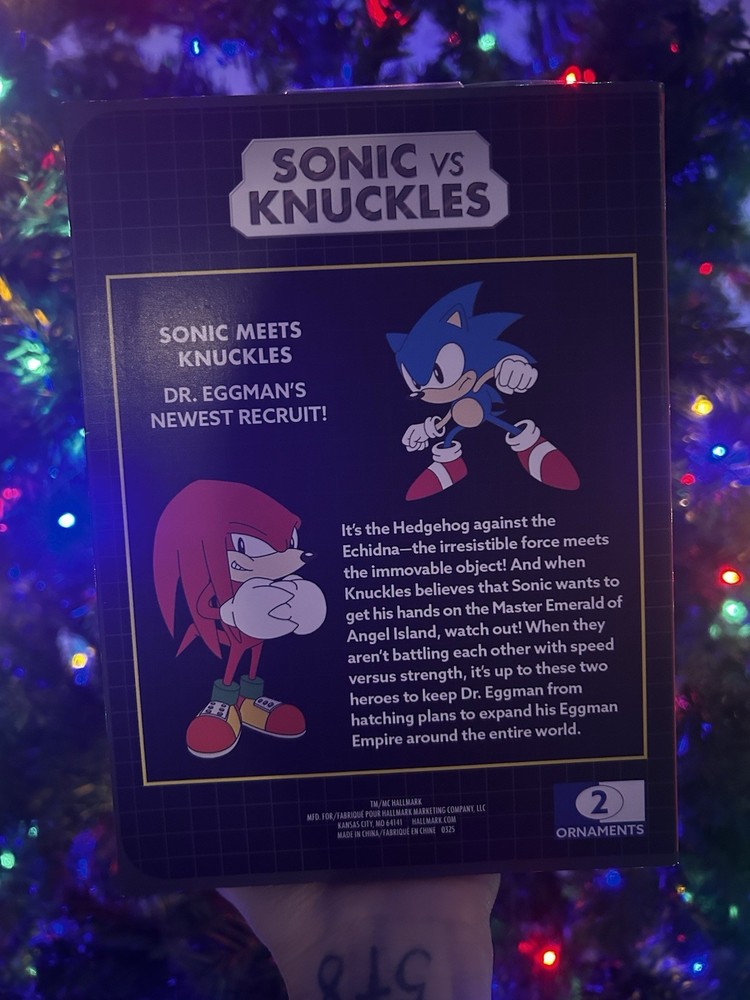 The Hallmark Sonic the Hedgehog & Knuckles Christmas Ornament Set of 2 features two irregularly shaped ornaments depicting the beloved characters from the Sonic the Hedgehog