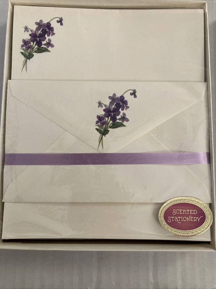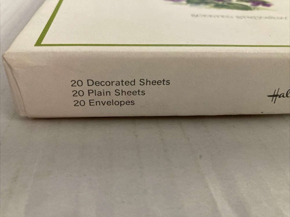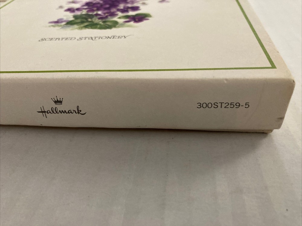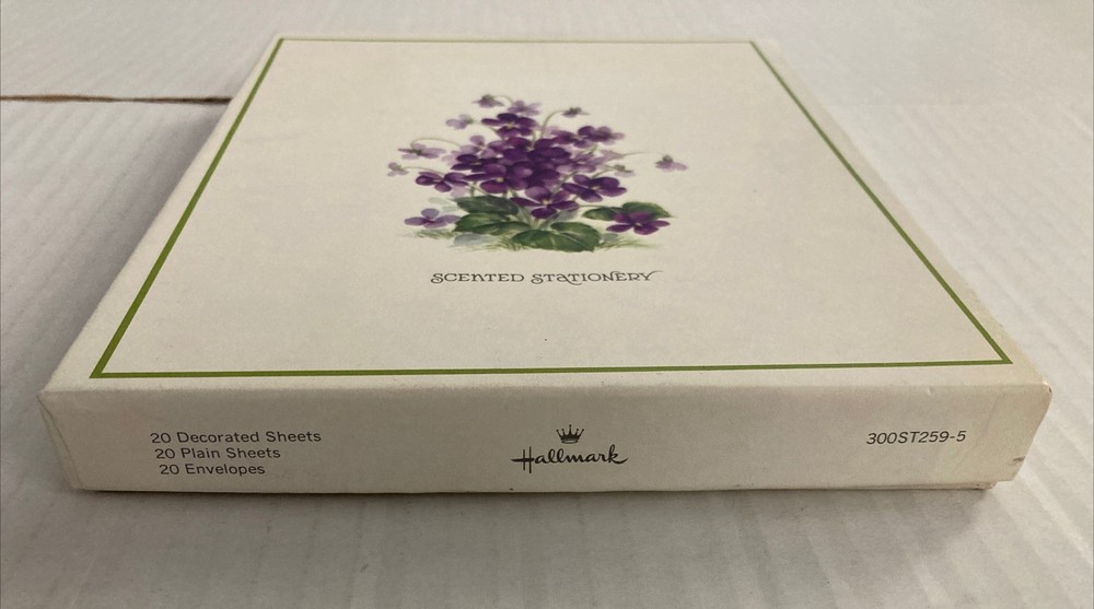 Box of vintage Hallmark scented stationary. Includes 20 decorated sheets, 20 plain sheets and 20 envelopes in original box. Box does show a bit of yellowing from age.