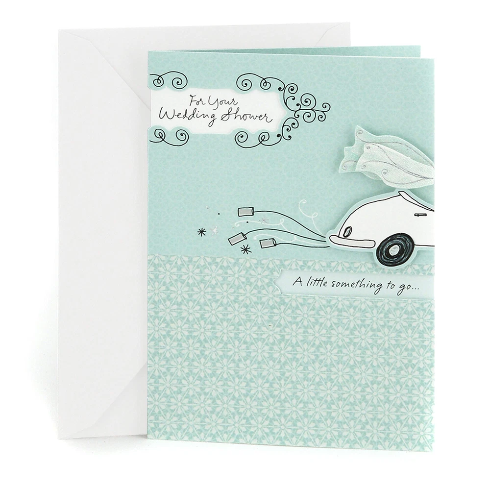 Share your best wishes to newlyweds in your life with this card designed with a newlyweds' car with cans driving away on light blue background with a background of white stars. The message on the front of the card reads, "Wishing you joy as you walk down the aisle…." Open the card to reveal the inside message, "...and love as you journey through life." The card measures 7.2 inches long by 5 inches wide made with high quality cardstock paper; an envelope is included. All Hallmark cards are made with paper from well-managed forests. Hallmark was founded in 1910 when 18-year-old J.C. Hall arrived in Kansas City, Missouri, with a couple of shoeboxes of postcards under his arm and the American dream in his heart. Today, more than a century later, Hallmark greeting cards are sold online and in nearly 40,000 retail stores across the globe and people continue to recognize the iconic Hallmark brand as "the very best." Front message: Wishing you joy as you walk down the aisle… Inside message: ...and love as you journey through life. Printed on high quality paper stock, this wedding card sends your love and congrats to a special couple. Card size: 5 inches wide and 7.2 inches long. All Hallmark cards are made with paper from well-managed forests.