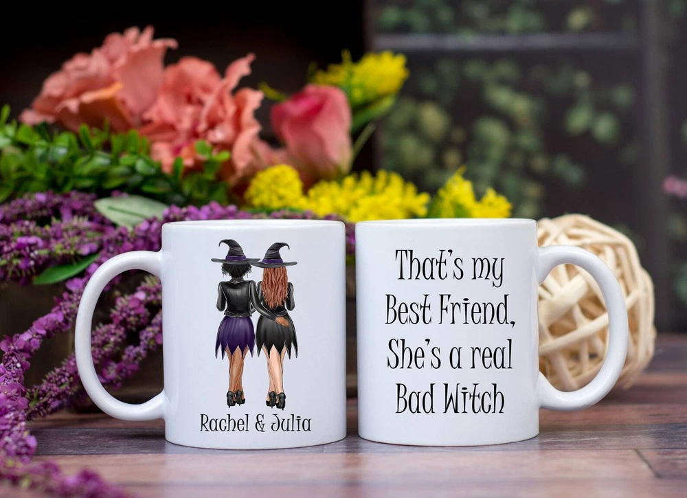 Halloween Best Friend Personalized Mug Custom Best Friend Mug Best Friend Witch Product Details.. This high quality 11oz. ceramic white mug has a premium hard coat that provides crisp and vibrant color reproduction sure to last for years. Perfect for all hot & cold beverages. The highest quality printing possible is used. It will never fade no matter how many times you wash it. Material: 100% Ceramic. Print both sides. Dishwasher and Microwave Safe. High Gloss + Premium White Finish. Printed in the U.S.A. Personalized & Custom. We support personalized and custom mug to add custom, when placing an order, you can add notes to the "order note" in shipping address section. Also you can contact us directly via message. Shipping Info. Ready to ship in 1 to 2 business days, All products are made-to-order and proudly printed in the United States. Shipped by USPS and DHL, You will receive your order in 5-7 days. Replace & Refund. All products are defective during shipping broken, chipped will be replaced free of charge. You are not satisfied with the product, we will refund 100% money to you. If any other issues arise, please do not hesitate to message, we would be more than happy to assist you.