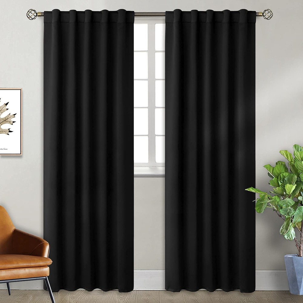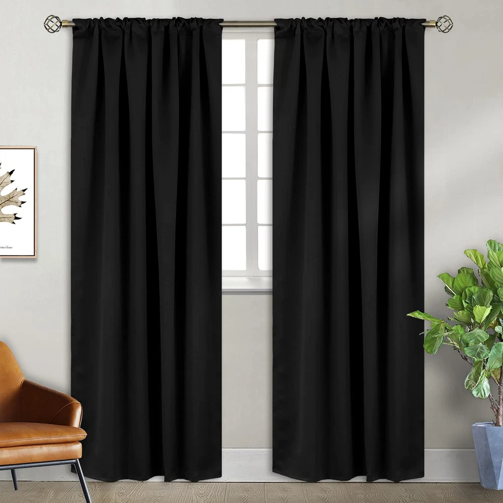 Dressing up for your windows with these premium blackout curtains from , addinfg elegant touch to your home. Our window curtains are made of durable fabric with exquisite workmanship, combined fashion and performance perfectly. Available in variety of sizes and rich colors, suitable for your bedroom, living room, dining room, infant room, kids room, office or other windows. Light Blocking & Noise Reducing: Our triple-weaved blackout curtains block 90% of sunlight, 100% of street light. Reduce outside traffic or neighbor noise. Creating a relax atmosphere to sleep or take a nap anytime. Thermal Insulated & Energy Saving: Our heavy duty curtains are effective at blocking out summer heat and winter cold. Balance room temperature for all seasons. Help you to save on energy cost. Absolute Privacy: Our curtain panels help to protect total privacy, ensure personal spaces are not be bothered. These room curtains stop light glaring through the window, supply you with the enjoyment of watching TV in real darkness. Care Instructions: Machine wash in clod water, general cycle with similar colors. Quick ironing, steam clean or tumble dry on backside at very low temperature. Do not bleach. Tips: Measurement: Curtains are measured before hanging, flat on floor. Lengths are from top to bottom. Size Advice:To insure a better room darkening effect, please choose curtain width 1.5-2 times than window wide. And install curtain rod 1.5 inch above window top. Color: Due to different computer screen display, the actual item color might slightly different from above images. For any questions, please contact us. We’re always here to help. Ready to decorate your window with Blackout Curtains? Package Includes: Set of 2 black blackout curtains; each panel measures 42 Inch wide by 84 Inch long, with 6 back tabs and 3” rod pocket fits most standard rods and makes the maximize coverage of windows. 3 Hanging Options: Our light blocking curtains can be styled in 3 ways: back loops, rod pocket or with your own clip - rings. These dual headers ( back tab and rod pocket ) will offer you flexible home decoration, and save money. Room Darkening: Our window curtains can block out 90%-99% above sunlight ( Darker colors work better ), perfect for night shifts, late sleepers and afternoon naps. Protect floor and upholstery from color shading. Thermal Insulated: Our energy saving curtains insulate against summer heat and winter chill to balance your room temperature, save your energy costs. Reduce outside noise. Care Instructions: Our heavy-duty room blackout curtains are machine washable in gentle cycle and cold water. Do not bleach. Warm iron or steam iron on backside, and tumble dry at low temperatures.