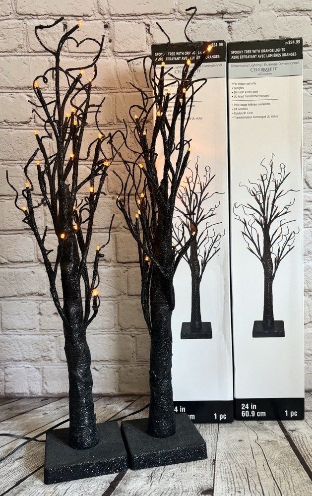 Halloween Black Spooky Trees Set of 2 Light Up 24” Celebrate It Orange Lights Bring eerie ambiance to your Halloween décor with this set of two light-up spooky trees from Celebrate It. Each tree stands 24 inches tall with black glittered branches tipped with glowing orange lights. The bendable, posable branches let you shape them to your liking, making them perfect for tabletops, entryways, or haunted displays. •Brand: Celebrate It Halloween •Set includes: 2 spooky black trees •Height: 24 inches each (60.9 cm) •Lights: 24 orange lights per tree •Branches: Bendable and posable •Cord: 36 inches (91.4 cm) with UL-listed transformer •Condition: Boxes show wear; trees appear new or mint condition •Use: Indoor only A glowing Halloween decoration set that adds just the right spooky touch. Ships securely with care.