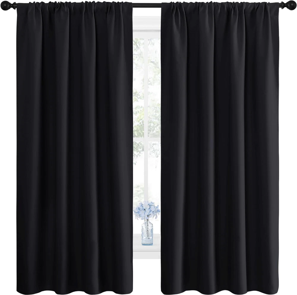 ELEGANT DESIGN: 2 panels per package. Each Blackout Curtain Panel measures 42 inches wide x 63 inches long. The NICETOWN drapery is constructed with rod pocket, fitting the curtain rod of your choice up to 2 inches in diameter, making the curtains easy to install and slide. LENGTH ADJUSTABLE: Don't worry if this blackout curtains are a few shorter than your windows. You can hang this curtain panels with rings and hooks. That could be adjustable for height max 3 inches. Hooks space distance around 4-6 inches. AMAZING MATERIAL: This unique, soft and heavy-duty blackout fabric is woven with three-layer construction. The middle layer of black yarns creates a curtain panel that is excellent for blocking out 85%-99% of light (Dark color works better on blocking light) while providing privacy. GOOD CHOICE: Perfect drapery option for anyone seeking to block daylight, take a nap, or keep sun glare off your TV. Besides, you can choose blackout valance and sheer curtains in the NICETOWN store to match. Such curtain sets provide a more permanent harmonious window dressing. EASY MAINTENANCE: Machine or hand washable. Mild detergent no bleaching. Low-temperature ironing. Measure your pole and window size before you choosing curtains. Product Description 1.9“ DIAM ROD POCKET Recommended with no greater than a 1.7-inch rod for maximum movement. HIGH DENSITY SUTURE The curtain fabric looks more exquisite and worthwhile. SAME FABRIC FRONT AND BACK The same fabric for both sides makes the curtain a simple style. TRIPLE WEAVE TECHNOLOGY Provide you with a perfect shading performance of about 50%-99% Blackout. DO WELL IN THERMAL INSULATED After insulating with the curtain, the temperature drops a lot. 1 ROD POCKET 2 HIGH DENSITY SUTURE 3 FRONT AND BACK 4 TRIPLE WEAVE FABRIC 5 THERMAL INSULATED COLOR SHADING DISPLAY THE COLOR OF THE ACTUAL ITEM MAY VARY SLIGHTLY IN DIFFERENT ENVIRONMENT The video showcases the product in use. The video guides you through product setup. The video compares multiple products. The video shows the product being unpacked. The video showcases the product in use. The video guides you through product setup. The video compares multiple products. The video shows the product being unpacked. POPULAR CURTAINS & RODS IN NICETOWN Add to Cart Add to Cart Add to Cart Add to Cart Add to Cart Add to Cart Add to Cart Customer Reviews 4.5 out of 5 stars 610 4.6 out of 5 stars 2,055 4.7 out of 5 stars 8,657 4.5 out of 5 stars 437 4.6 out of 5 stars 4,110 4.7 out of 5 stars 24,887 4.6 out of 5 stars 1,686 Price $42.99 $ 42 . 99 $17.85 $ 17 . 85 $17.91 $ 17 . 91 $19.95 $ 19 . 95 $23.95 $ 23 . 95 $12.45 $ 12 . 45 $32.93 $ 32 . 93 Top Styles Rod Pocket/Back Tab/Hook Belt Grommet Grommet Rod Pocket & Back Tab Rod Pocket Grommet - Fabric Faux Linen Triple Weave Thick Linen Faux Linen Sheer Faux Linen Sheer Faux Linen Sheer Voile Sheer Aluminum Light Filtering √ √√ √√√ √√√ √√√ √√√√ - Privacy √√√√√ √√√√ √√√ √√√ √√√ √ - Room Darkening ✔ ✔ ✔ ✘ ✘ ✘ ✘