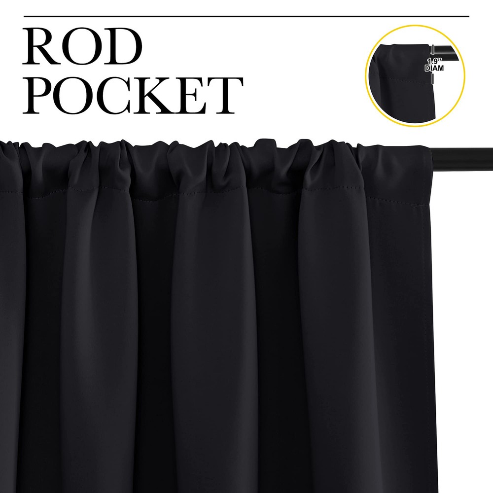 ELEGANT DESIGN: 2 panels per package. Each Blackout Curtain Panel measures 42 inches wide x 63 inches long. The drapery is constructed with rod pocket, fitting the curtain rod of your choice up to 2 inches in diameter, making the curtains easy to install and slide. LENGTH ADJUSTABLE: Don't worry if this blackout curtains are a few shorter than your windows. You can hang this curtain panels with rings and hooks. That could be adjustable for height max 3 inches. Hooks space distance around 4-6 inches. AMAZING MATERIAL: This unique, soft and heavy-duty blackout fabric is woven with three-layer construction. The middle layer of black yarns creates a curtain panel that is excellent for blocking out 85%-99% of light (Dark color works better on blocking light) while providing privacy. GOOD CHOICE: Perfect drapery option for anyone seeking to block daylight, take a nap, or keep sun glare off your TV. Besides, you can choose blackout valance and sheer curtains in the store to match. Such curtain sets provide a more permanent harmonious window dressing. EASY MAINTENANCE: Machine or hand washable. Mild detergent no bleaching. Low-temperature ironing. Measure your pole and window size before you choosing curtains.