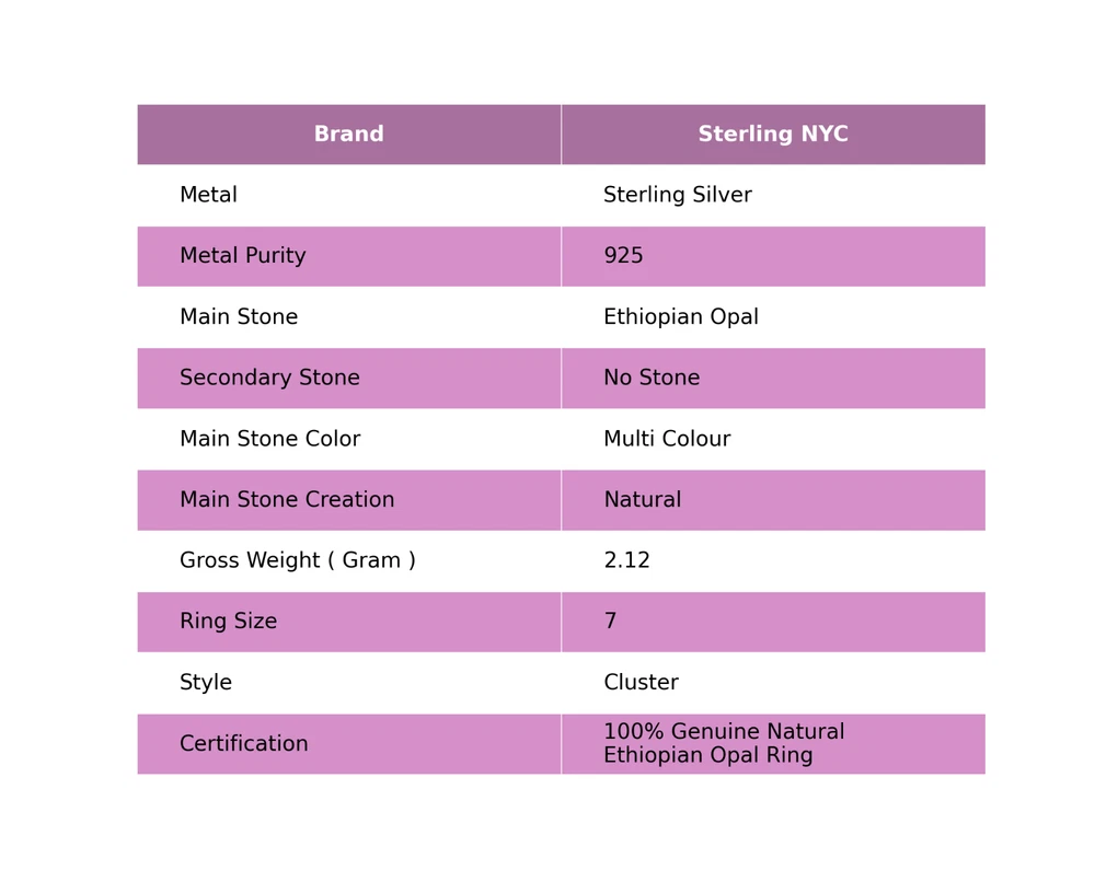 Welcome to Sterling NYC Natural Ethiopian Opal Gemstone 925 Silver Cluster Ring Size 7 For Women Handmade Ring, Sterling Silver Ring, Ethiopian Opal Ring, Handcrafted Ring Specifications:- SKU : JS-60703 Gemstone : Ethiopian Opal Stone Shape : As Seen In Picture Metal Purity : 925 Sterling Silver Ring Size : 7 US Adjustable : ----------------------------------------------------------------------------------------------------- Experience the timeless allure of silver jewelry, a cherished choice known for its exceptional properties and countless rewards. Explore the captivating charm of its unique attributes, enveloping you with elegance and remarkable healing qualities. Immerse yourself in the enigmatic world of silver, where beauty and benefits harmoniously intertwine. Benefits: Embrace the Elegance : Silver jewelry seamlessly blends accessible luxury with timeless beauty, elevating any jewelry collection without the need for extravagant spending. A Mindful Companion : Adorn yourself with silver jewelry as a gentle nudge towards mindfulness, a tangible reminder to cherish the beauty of every moment. Amplify Positivity : Silver, known for its energy-conducting qualities, is thought to enhance the power of positive intentions and affirmations, aiding in the clear manifestation of your desires. Unleash Self-Expression : Silver jewelry, with its versatile designs, empowers individuals to express their unique style, allowing their personality to shine through every piece. Soothing Serenity : Silver's cooling properties are believed to have a therapeutic effect, bestowing a sense of relief and tranquility upon both body and mind. ----------------------------------------------------------------------------------------------------- For Mother's Day Gift For Father's Day Gift For Promise For Valentine' Day For Halloween Party For Christmas Day Gift For New Year Party For Mom For Her ----------------------------------------------------------------------------------------------------- Discover the impeccable designs tailored just for you, and receive personalized guidance by reaching out to us. Our skilled artisans meticulously handcraft each piece in our workshop, infusing them with love and unwavering attention to detail. Your visit holds immense significance to us, and we are committed to ensuring that your shopping experience is nothing short of exceptional. Thank you for choosing us; we sincerely hope you thoroughly enjoy your shopping journey. Happy shopping! ----------------------------------------------------------------------------------------------------- At SterlingNYC, exquisite craftsmanship meets premium sterling silver gemstone jewelry. Our handcrafted pieces reflect authenticity and uniqueness, a testament to our commitment to excellence. Explore our collection and create your own dazzling jewelry ensemble.
