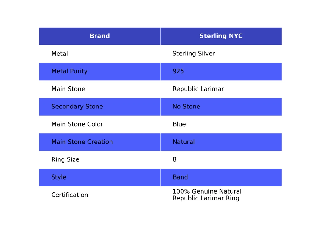 Welcome to Sterling NYC Natural Republic Larimar Gemstone Band Ring Size 8 925 Sterling Silver Jewelry Handmade Ring, Sterling Silver Ring, Republic Larimar Ring, Handcrafted Ring Specifications:- SKU : JS-45410 Gemstone : Republic Larimar Stone Shape : As Seen In Picture Metal Purity : 925 Sterling Silver Ring Size : 8 US Adjustable : ----------------------------------------------------------------------------------------------------- Experience the timeless allure of silver jewelry, a cherished choice known for its exceptional properties and countless rewards. Explore the captivating charm of its unique attributes, enveloping you with elegance and remarkable healing qualities. Immerse yourself in the enigmatic world of silver, where beauty and benefits harmoniously intertwine. Benefits: Embrace the Elegance : Silver jewelry seamlessly blends accessible luxury with timeless beauty, elevating any jewelry collection without the need for extravagant spending. A Mindful Companion : Adorn yourself with silver jewelry as a gentle nudge towards mindfulness, a tangible reminder to cherish the beauty of every moment. Amplify Positivity : Silver, known for its energy-conducting qualities, is thought to enhance the power of positive intentions and affirmations, aiding in the clear manifestation of your desires. Unleash Self-Expression : Silver jewelry, with its versatile designs, empowers individuals to express their unique style, allowing their personality to shine through every piece. Soothing Serenity : Silver's cooling properties are believed to have a therapeutic effect, bestowing a sense of relief and tranquility upon both body and mind. ----------------------------------------------------------------------------------------------------- For Mother's Day Gift For Father's Day Gift For Promise For Valentine' Day For Halloween Party For Christmas Day Gift For New Year Party For Mom For Her ----------------------------------------------------------------------------------------------------- Discover the impeccable designs tailored just for you, and receive personalized guidance by reaching out to us. Our skilled artisans meticulously handcraft each piece in our workshop, infusing them with love and unwavering attention to detail. Your visit holds immense significance to us, and we are committed to ensuring that your shopping experience is nothing short of exceptional. Thank you for choosing us; we sincerely hope you thoroughly enjoy your shopping journey. Happy shopping! ----------------------------------------------------------------------------------------------------- At SterlingNYC, exquisite craftsmanship meets premium sterling silver gemstone jewelry. Our handcrafted pieces reflect authenticity and uniqueness, a testament to our commitment to excellence. Explore our collection and create your own dazzling jewelry ensemble.