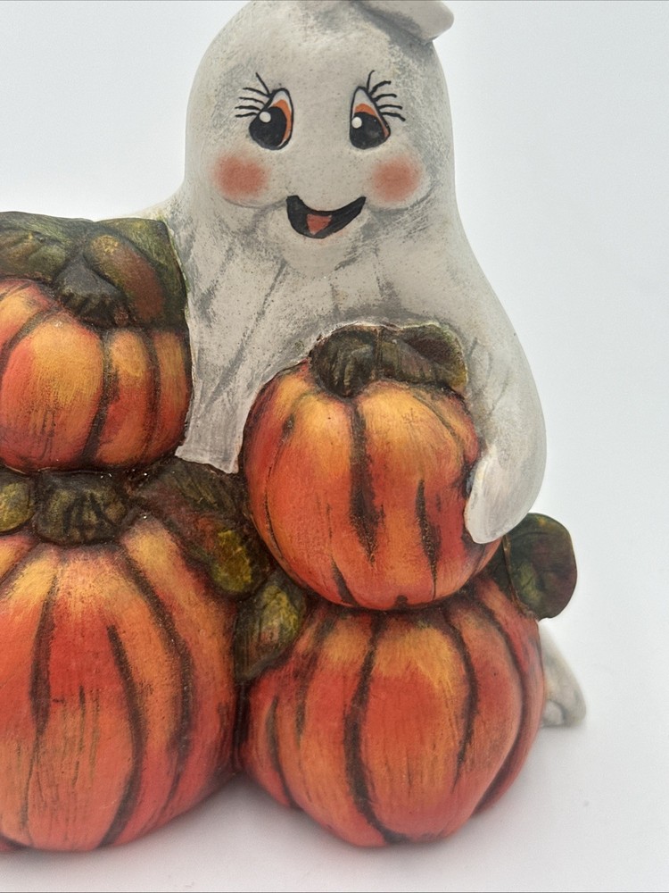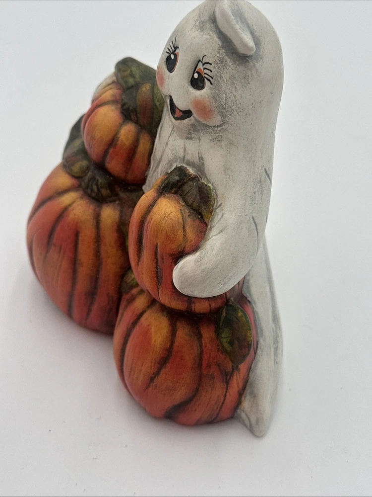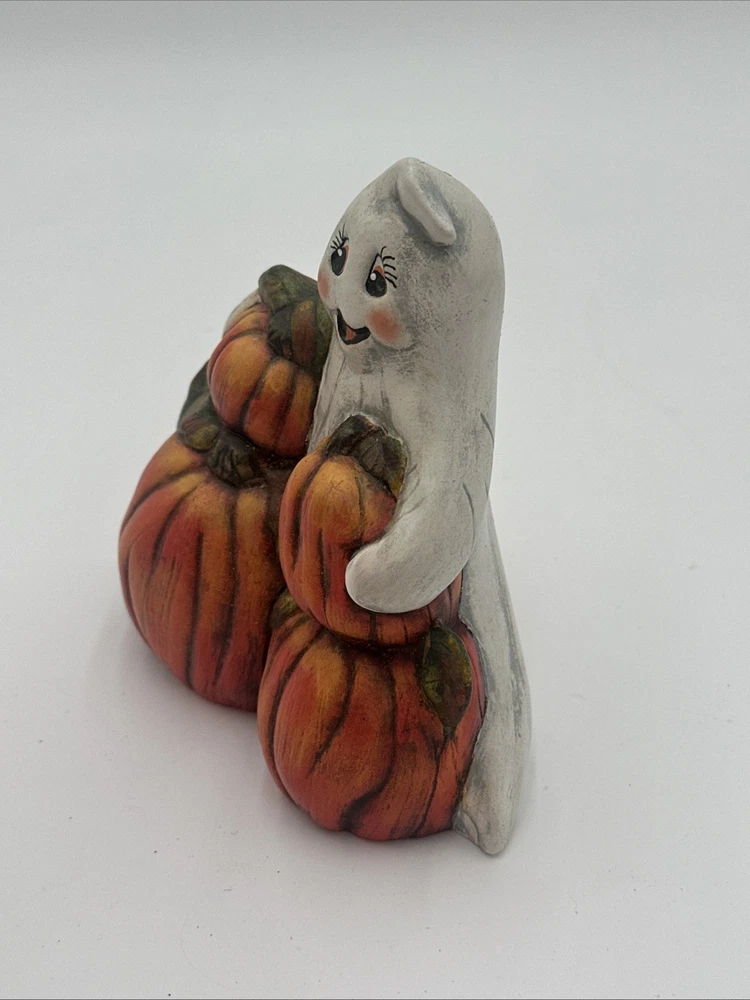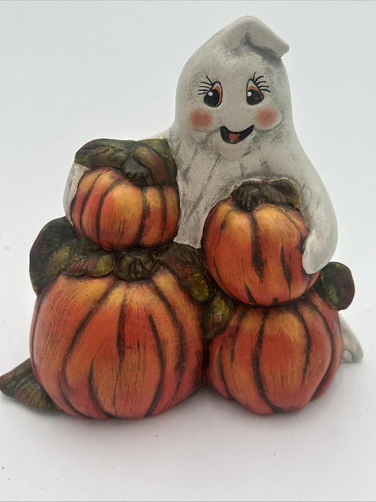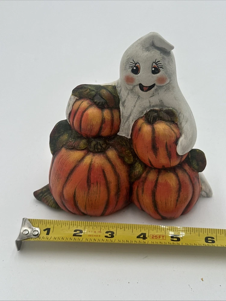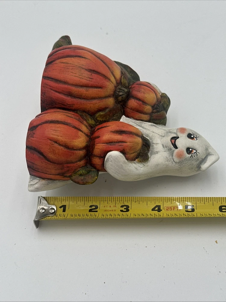 This vintage Halloween ceramic ghost with pumpkins by BB is a charming collectible item perfect for adding a touch of spooky decor to your home during the Halloween season. Made of high-quality ceramic, this unique piece features a ghostly figure holding up a bunch of pumpkins, creating a playful and festive atmosphere. Display it on a shelf or tabletop to bring a touch of whimsy to your Halloween celebrations.