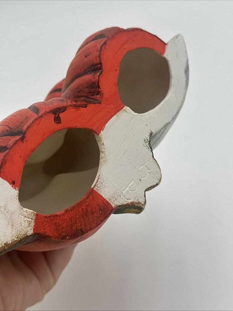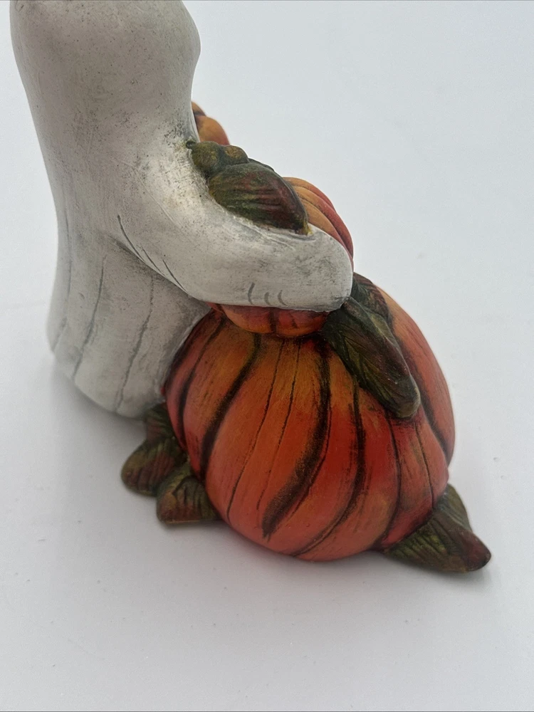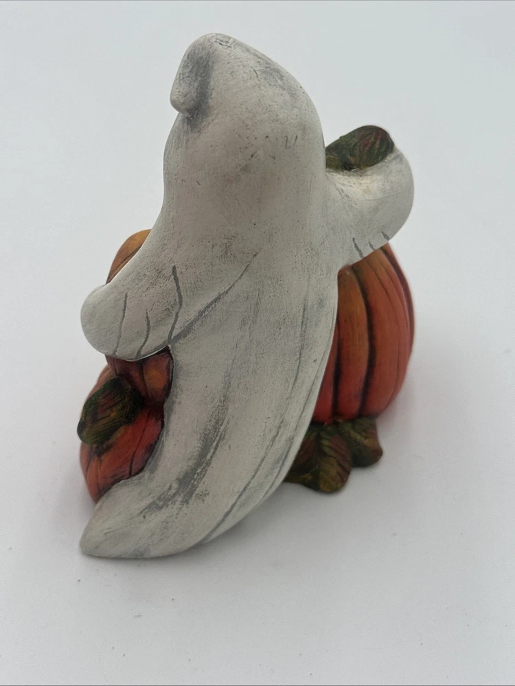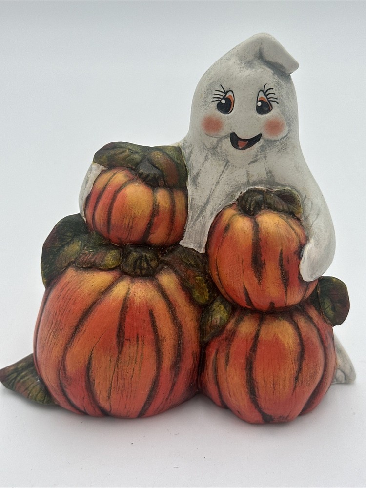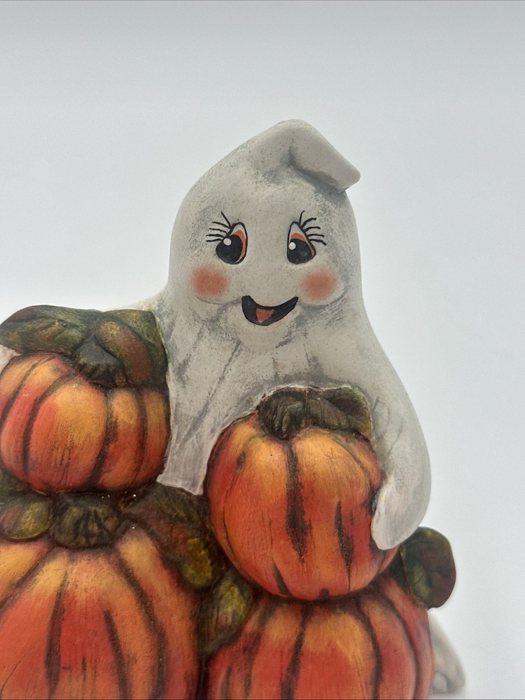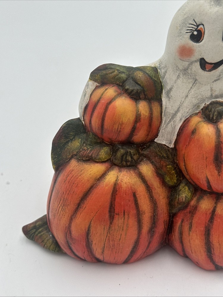 This vintage Halloween ceramic ghost with pumpkins by BB is a charming collectible item perfect for adding a touch of spooky decor to your home during the Halloween season. Made of high-quality ceramic, this unique piece features a ghostly figure holding up a bunch of pumpkins, creating a playful and festive atmosphere. Display it on a shelf or tabletop to bring a touch of whimsy to your Halloween celebrations.