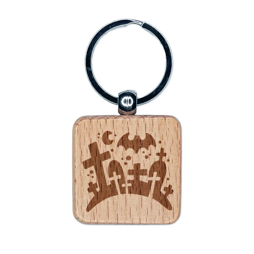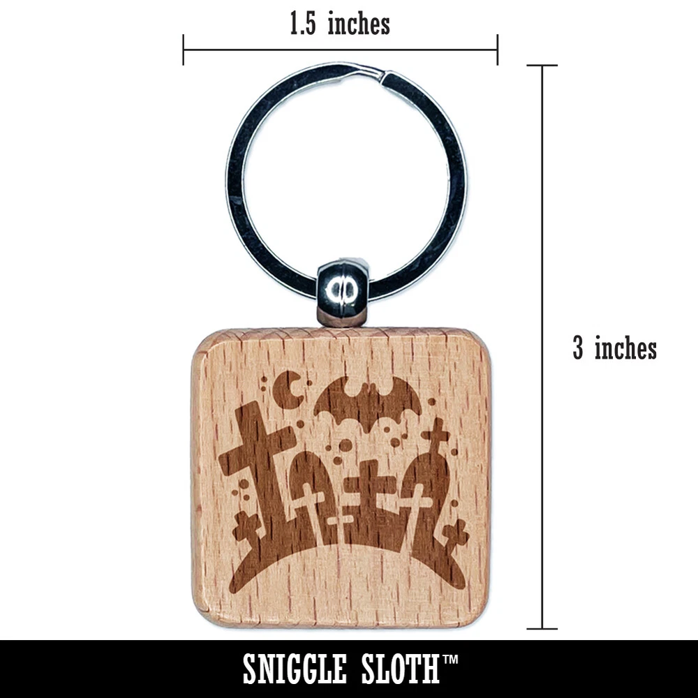 Halloween Graveyard Cemetery Tombstones Engraved Wood Square Keychain Tag Charm